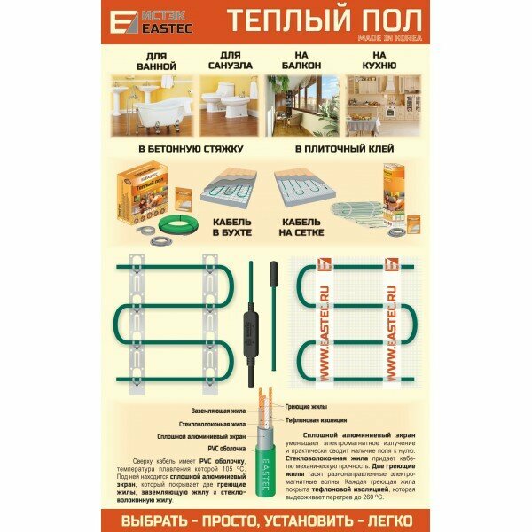 Комплект теплого пола В стяжку или Плиточный клей EASTEC ECC -500 (2,6-3,1 м. кв.) с механическим терморегулятором