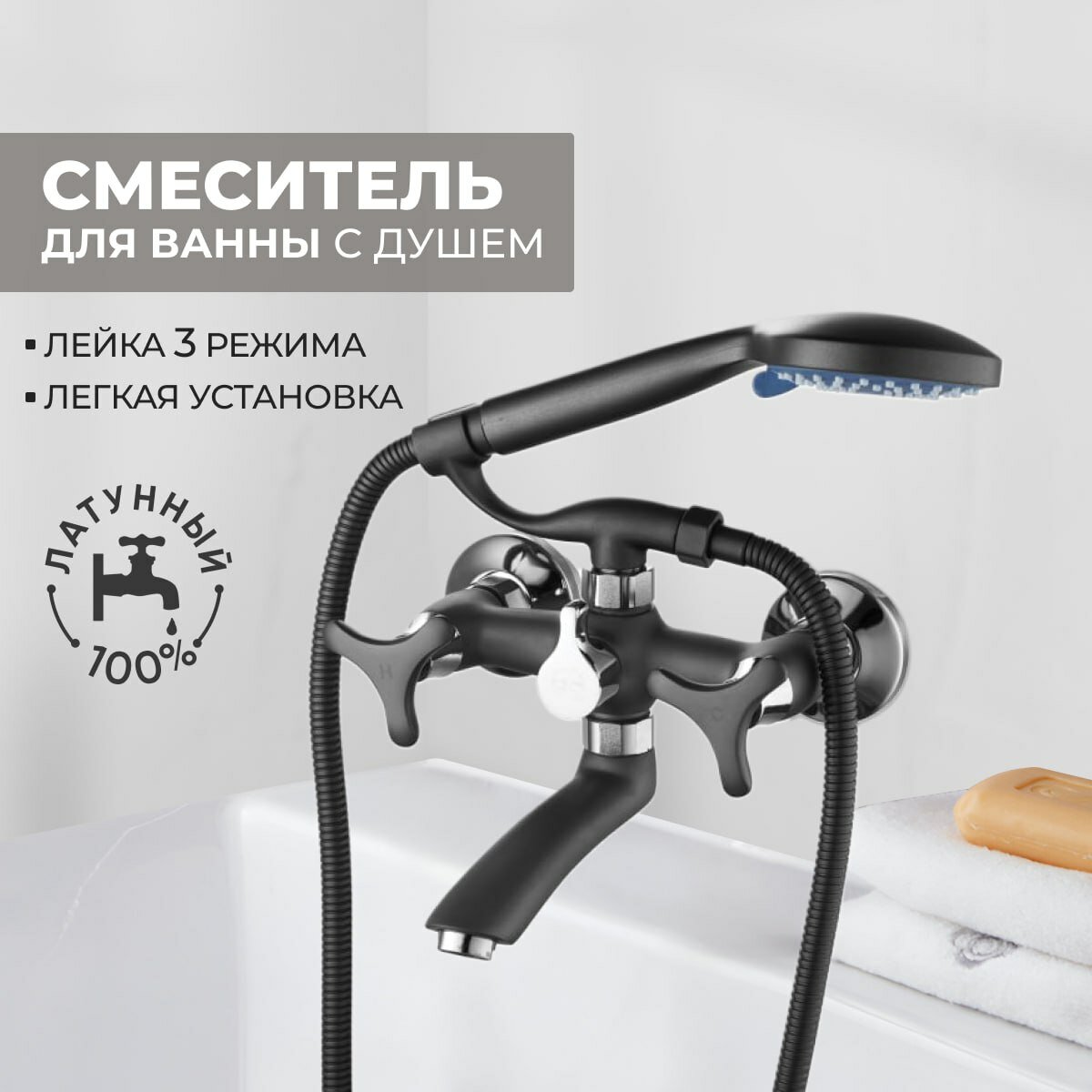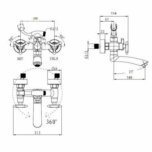 | Комплектация | Смеситель для ванны с душем / лейка - 3 режимная душевая лейка ABS пластик с функцией легкой очистки / держатель для лейки / шланг 1,5 м / эксцентрики. |