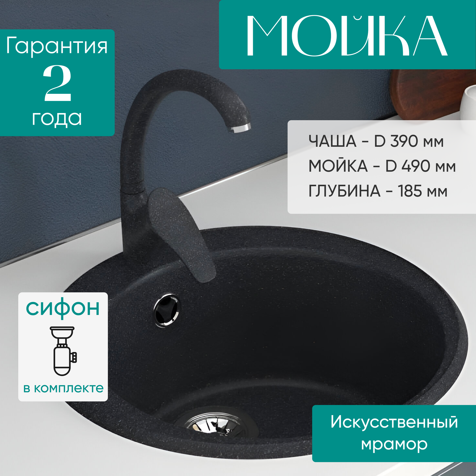 СохранитьМойка для кухни GS-1 308 из искусственного камня с сифоном, черный матовый интересное: