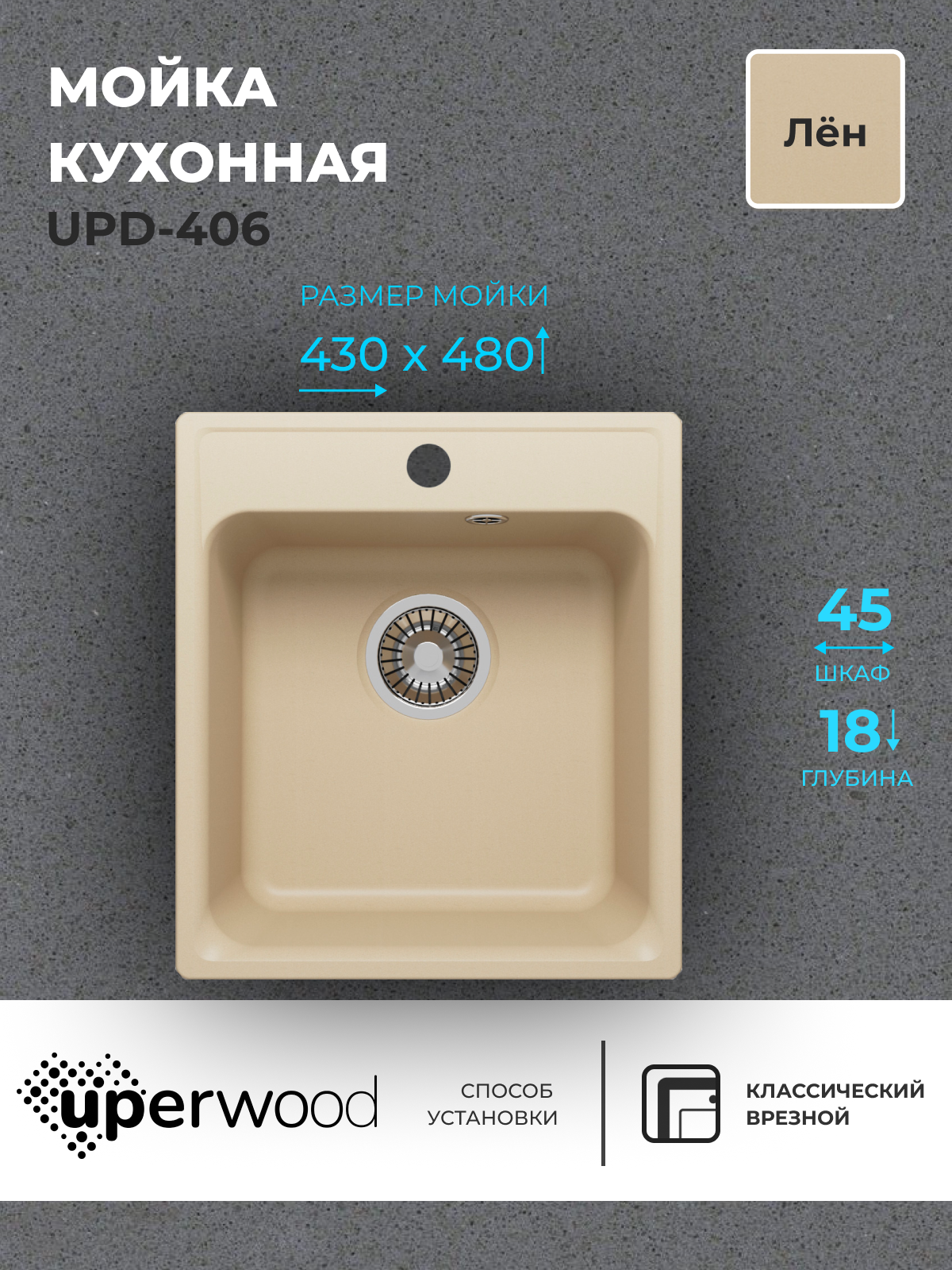 Кухонная мойка из искусственного камня Uperwood UPD-406, прямоугольная, цвет лён интересное: