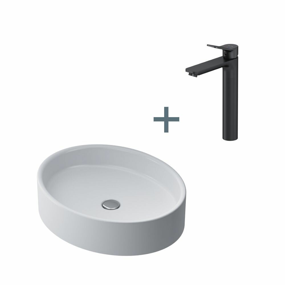 Раковина для ванной AM.PM Func накладная со смесителем X-Joy черный, 55 см, на столешницу, овал, фарфор, белый глянец, гарантия 25 лет, интересное:
