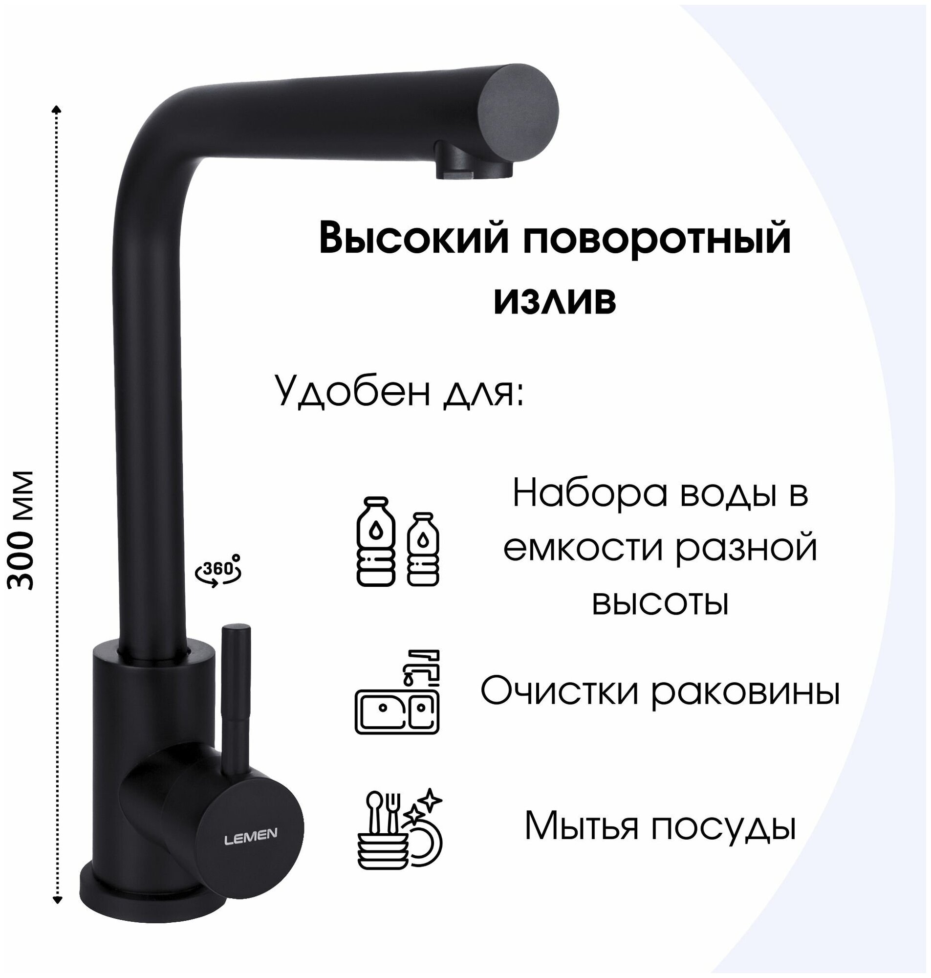 Смеситель для кухни с высоким поворотным изливом, Lemen, нержавеющая сталь, черный матовый интересное: