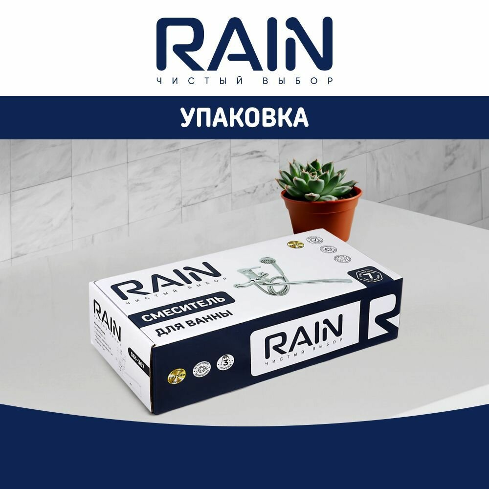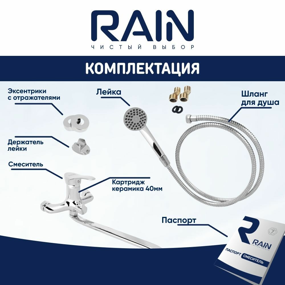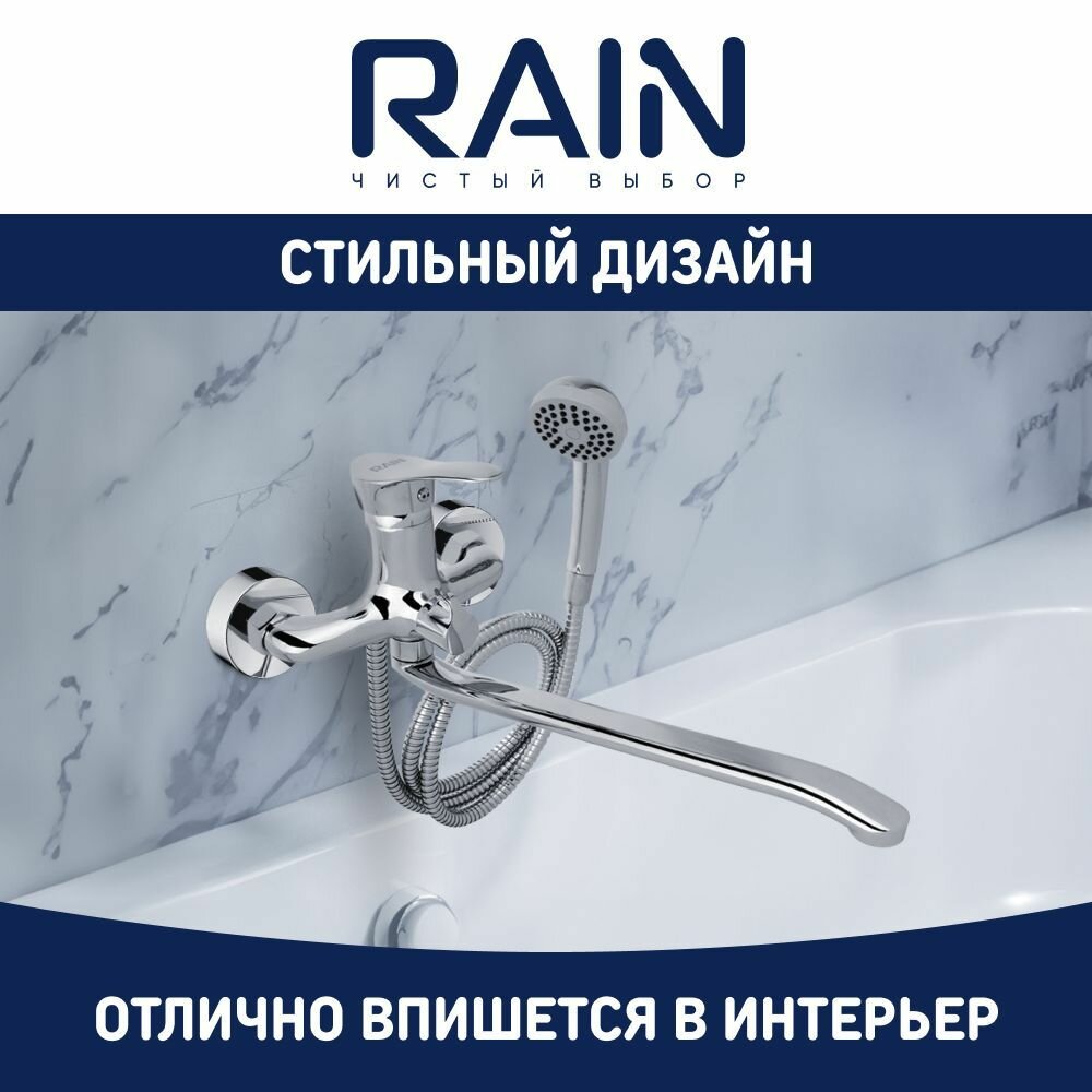 Смеситель для ванны с душем RAIN Мира однорычажный, изогнутый излив 35 см, лейка и шланг для душа в комплекте