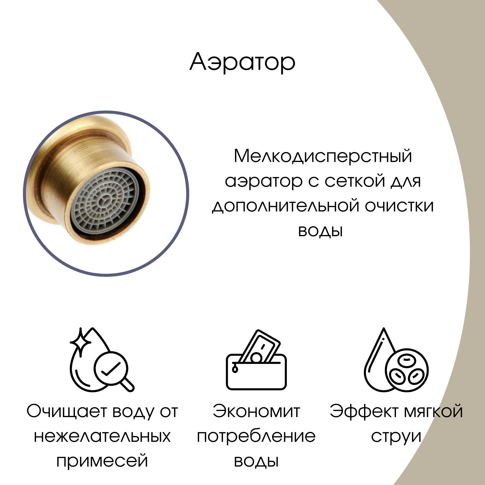 | Особенности | аэратор / поворотный излив / система быстрого монтажа |