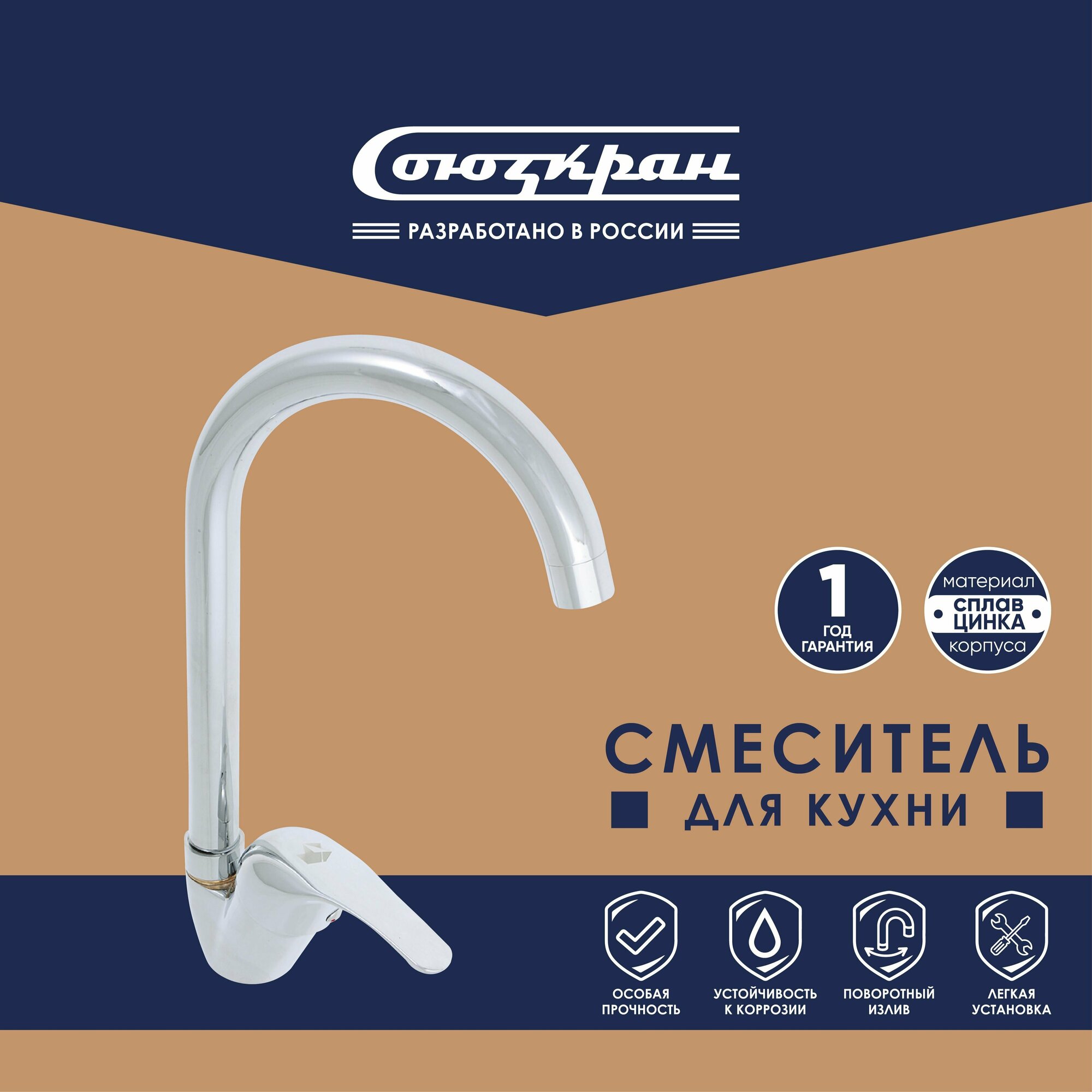 СоюзКран Смеситель для кухни, поворотный излив 25см, керам. картридж 40мм, хром, цинк, SK01-R119