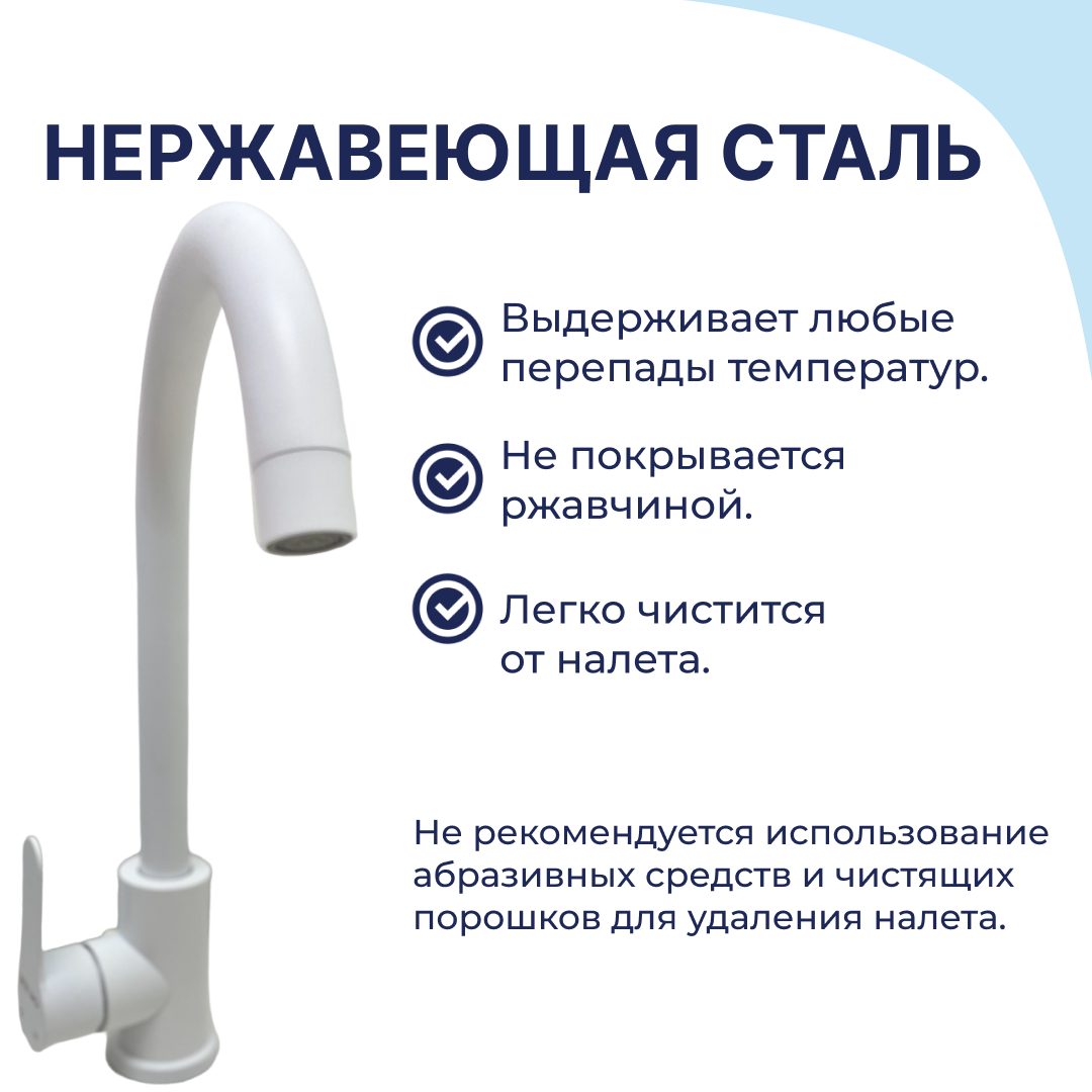 СохранитьСмеситель для кухни белый / Смеситель для кухни с поворотным изливом / Смеситель на кухню / Смеситель кухонный / Нержавеющая сталь/ Белый матовый. интересное:
