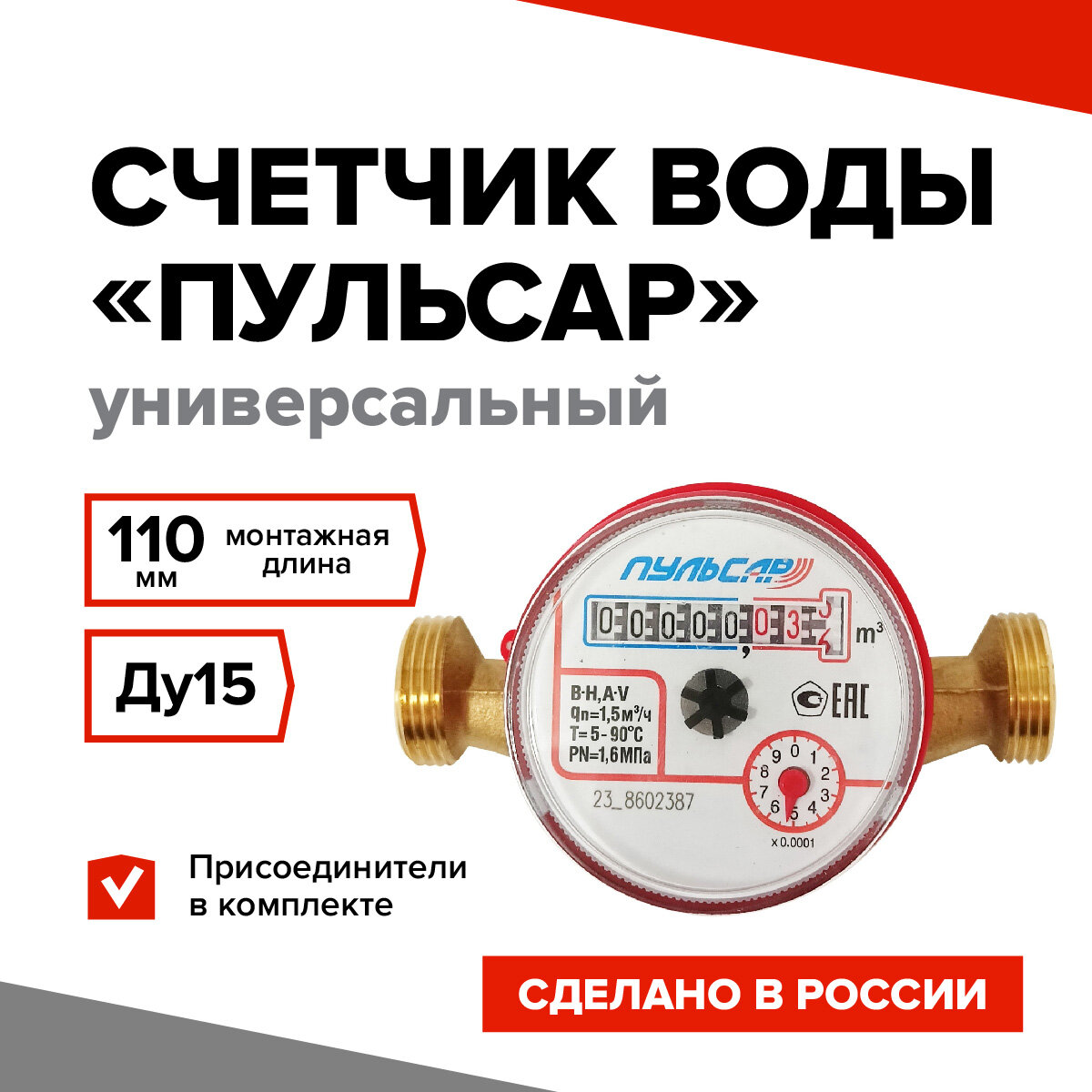 Счетчик воды Пульсар универсальный Ду15, L110 мм с монтажным комплектом