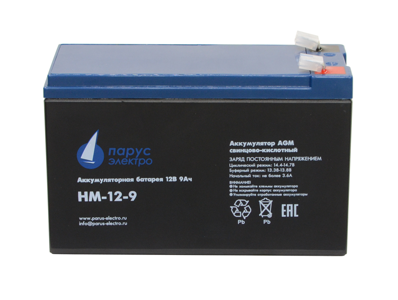 Парус электро HM-12-9, Батарея Парус Электро, стандартная серия HM-12-9, напряжение 12В, емкость 9Ач (разряд 20 часов), макс. ток разряда (5
