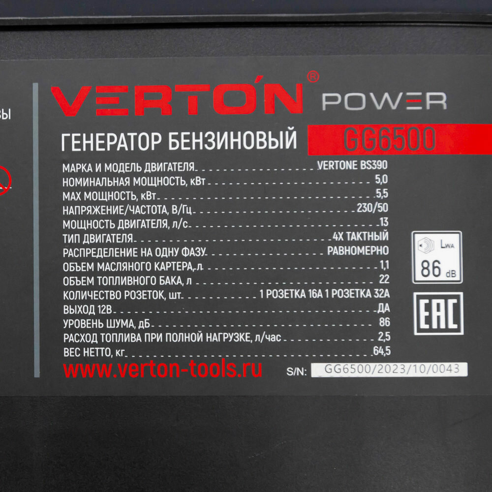 Генератор бензиновый VERTON POWER GG6500 (5,0/5,5 кВт, 230В, 13л.с., ручной старт, 12В, бак 22л, счетчик моточасов) интересное:
