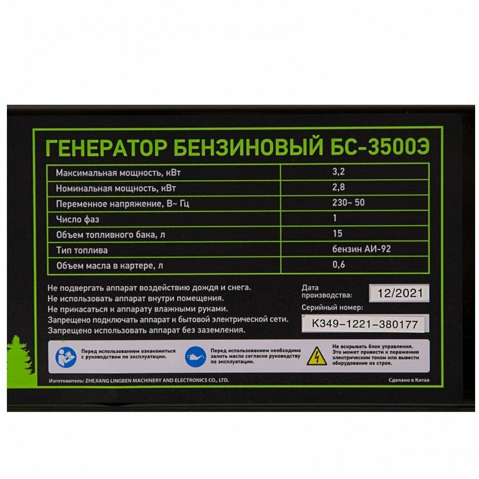 Генератор бензиновый БС-3500Э, 3,2 кВт, 230В, 15 л, электростартер// Сибртех интересное: