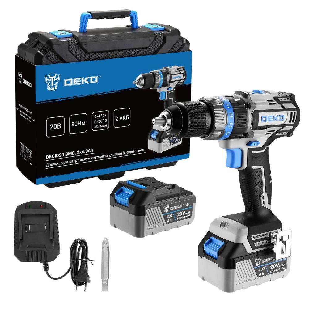 Купить Дрель-шуруповерт аккумуляторная Deko DKCID20, ударная, бесщеточная, 2*20В 3.0Ач, 80Нм
