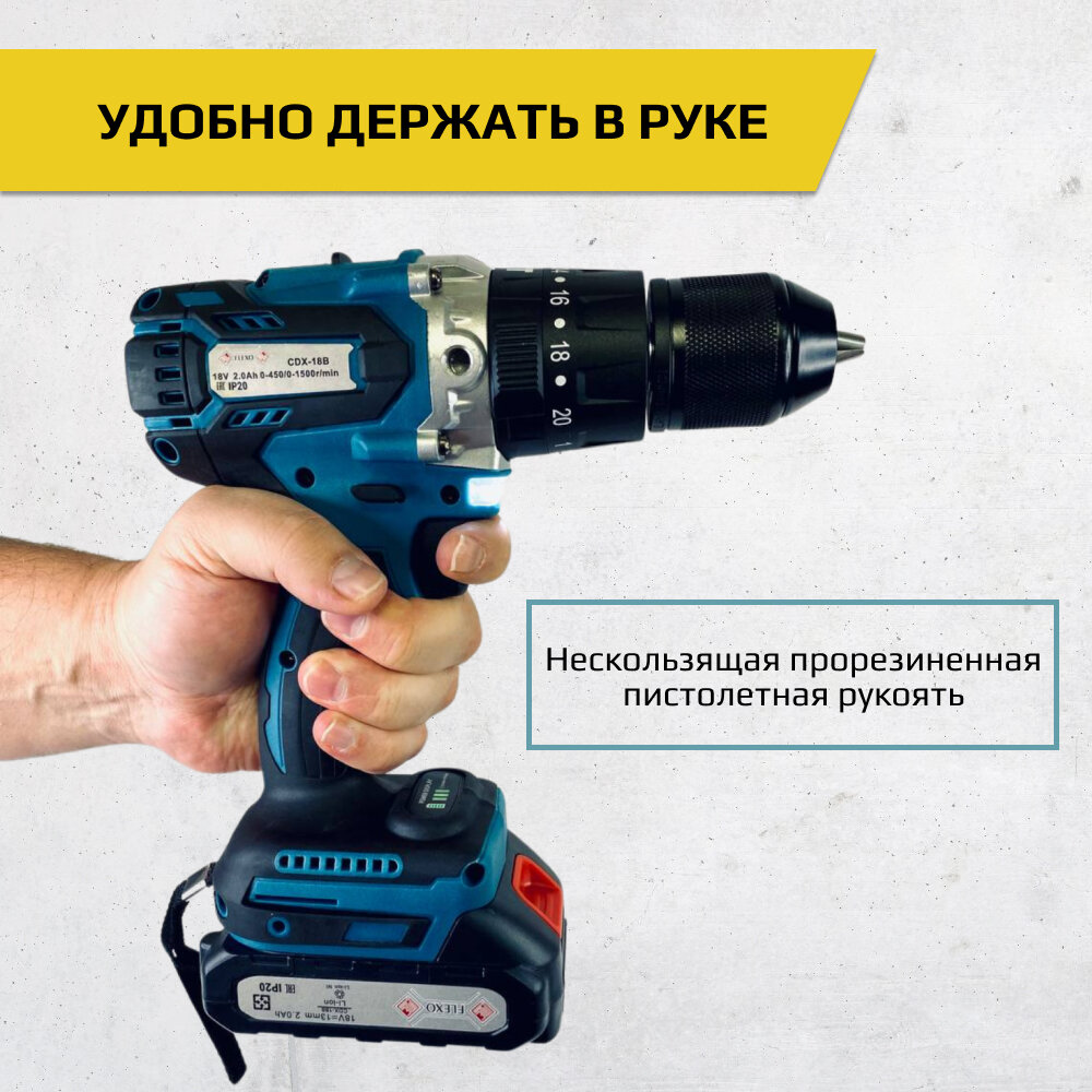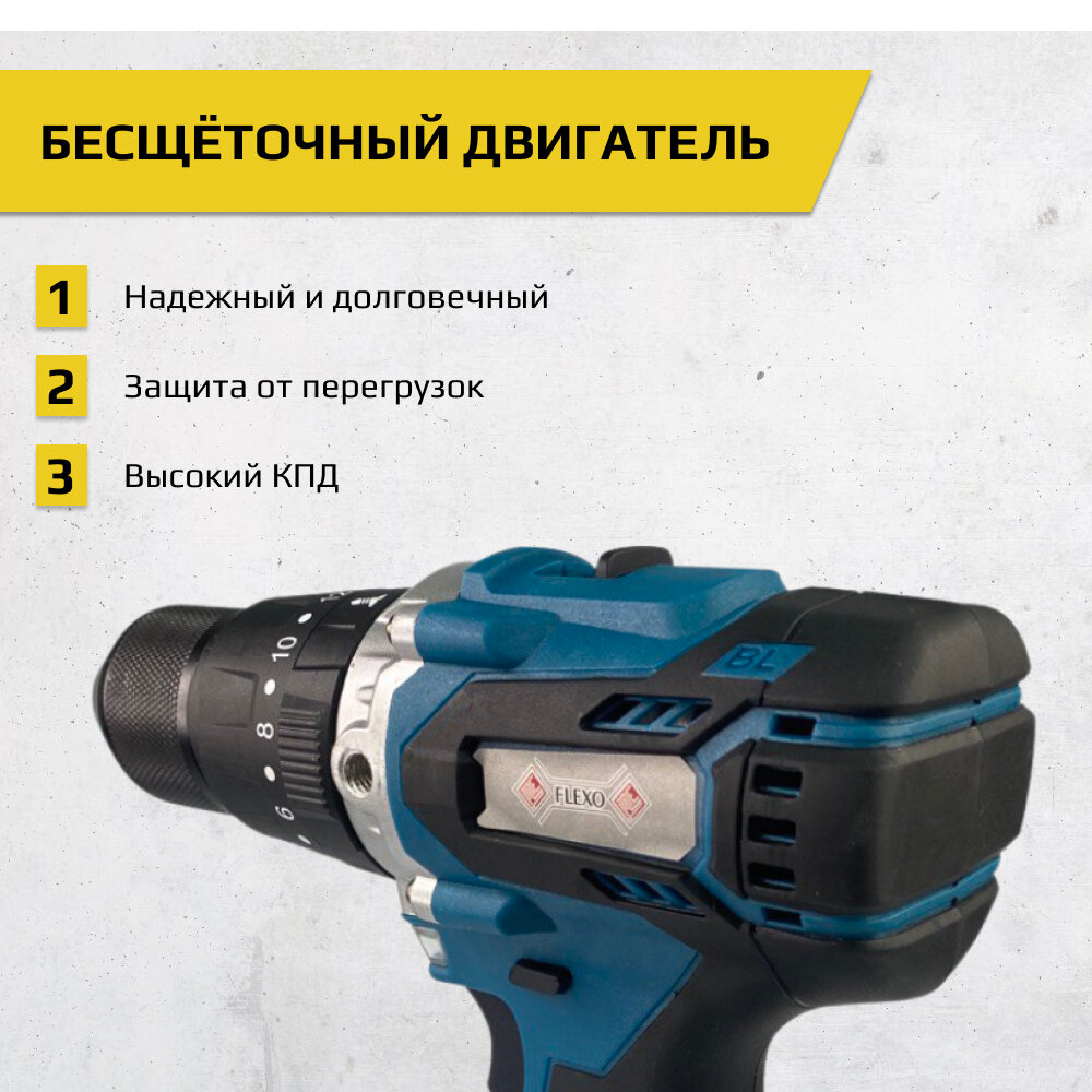 Аккумуляторная ударная бесщеточная дрель-шуруповерт FLEXO, 18В, 2х2 А·ч Li-Ion, в кейсе, CDX-18B интересное: