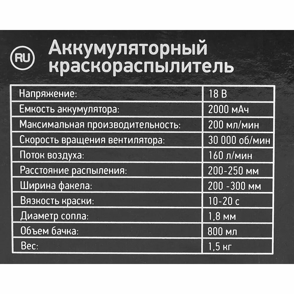 | Комплектация | Краскопульт аккумуляторный Schtaer S633B, 20 В Li-ion 1x2 Ач, 200 мл/мин |