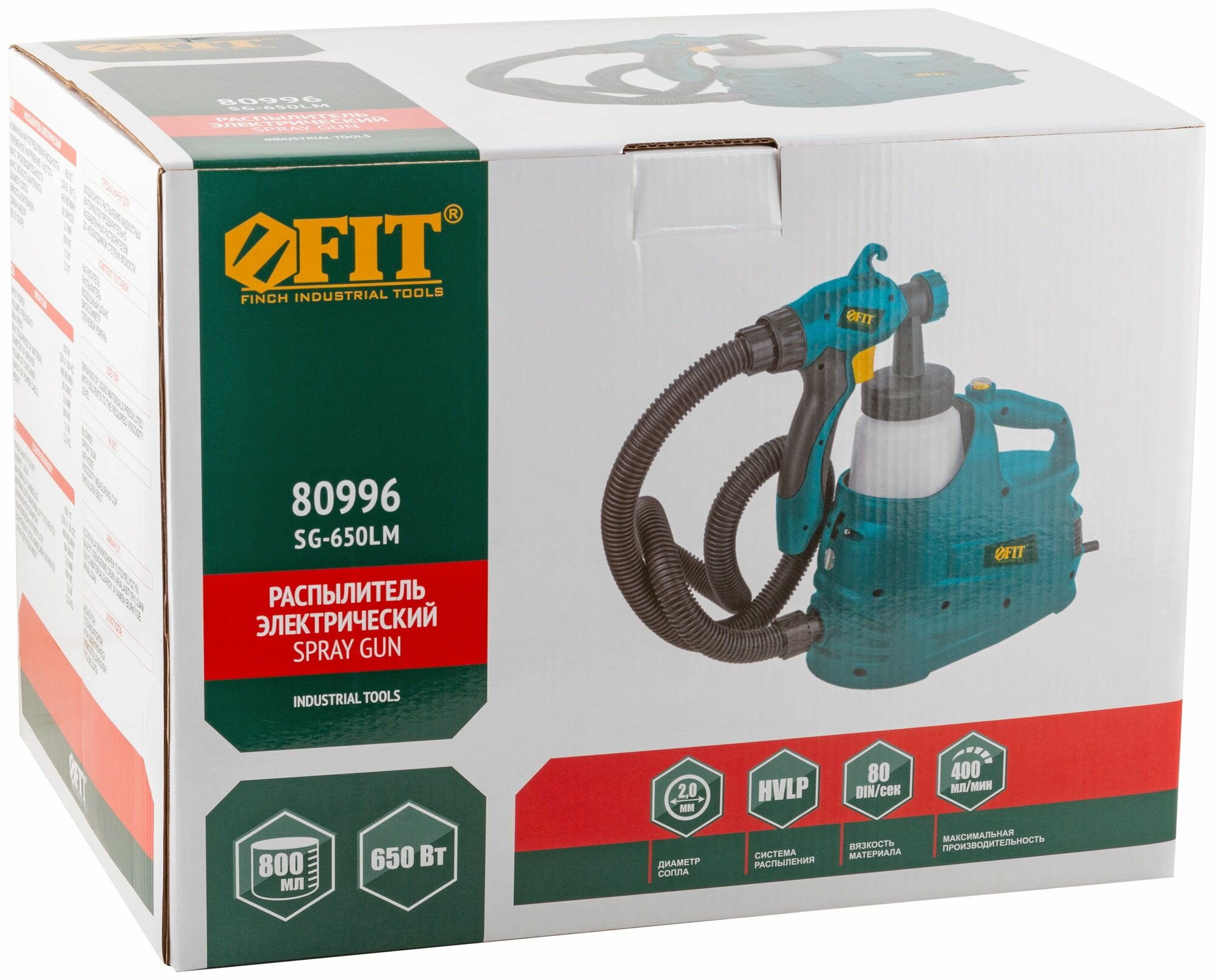 Распылитель электрический 650 Вт; 2,0 мм; 800 мл; 80 DIN/сек; 400 мл/мин; HVLP; коробка FIT 80996
