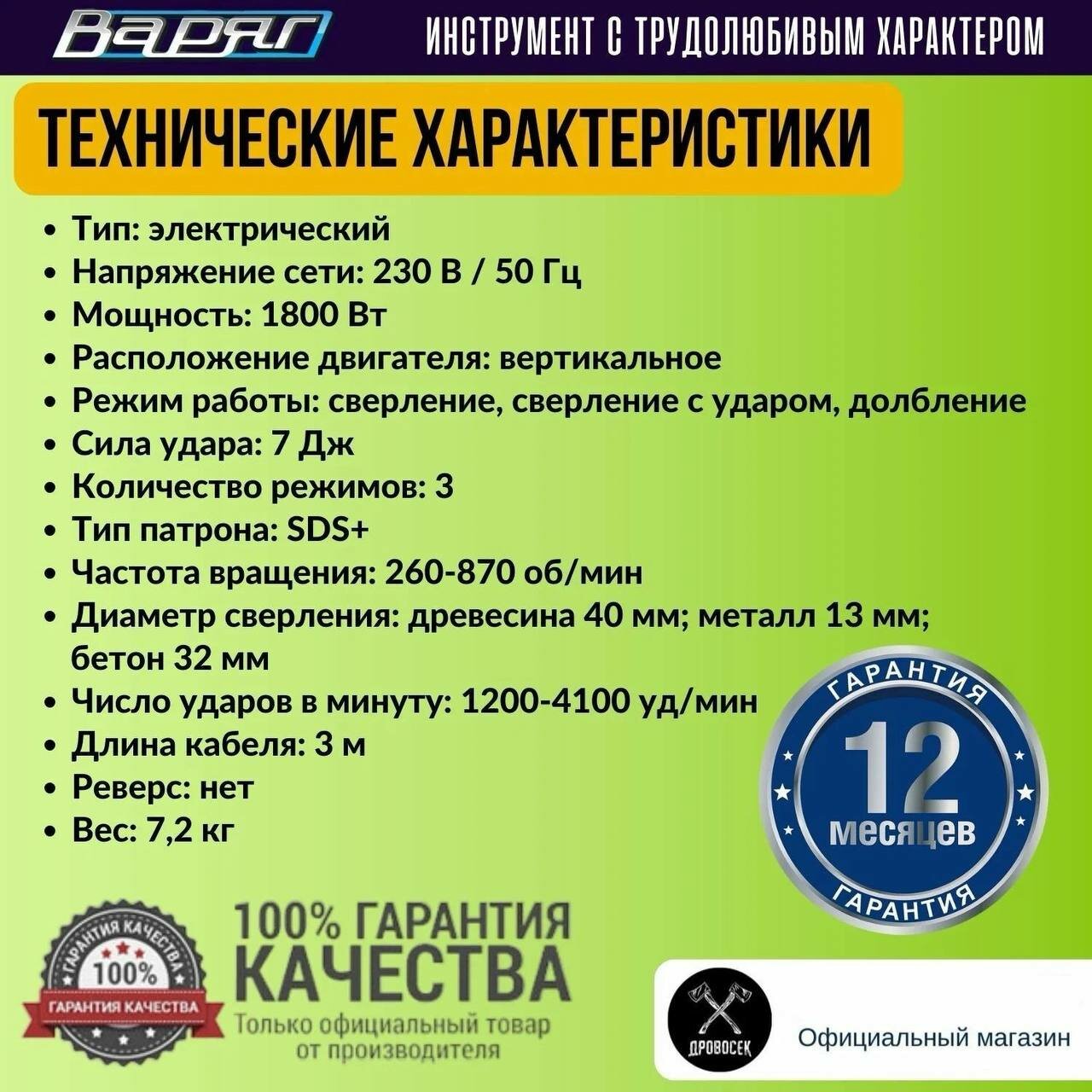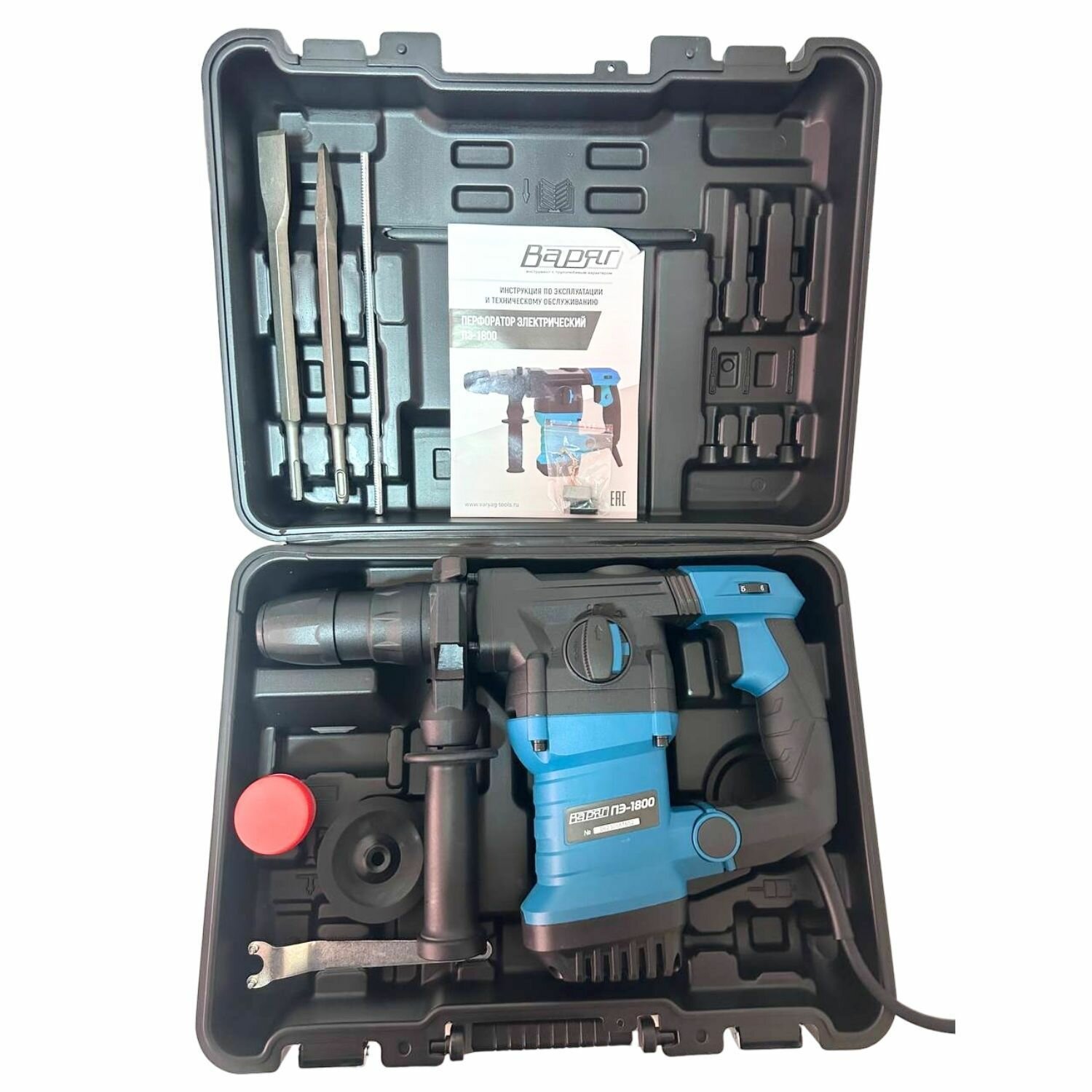 Перфоратор SDS-Plus Варяг ПЭ-1800 сетевой (1800 Вт, 260-870 об/мин, 1200-4100 уд/мин, 7 Дж, 3 реж, SDS+) электрический, в кейсе, от сети интересное: