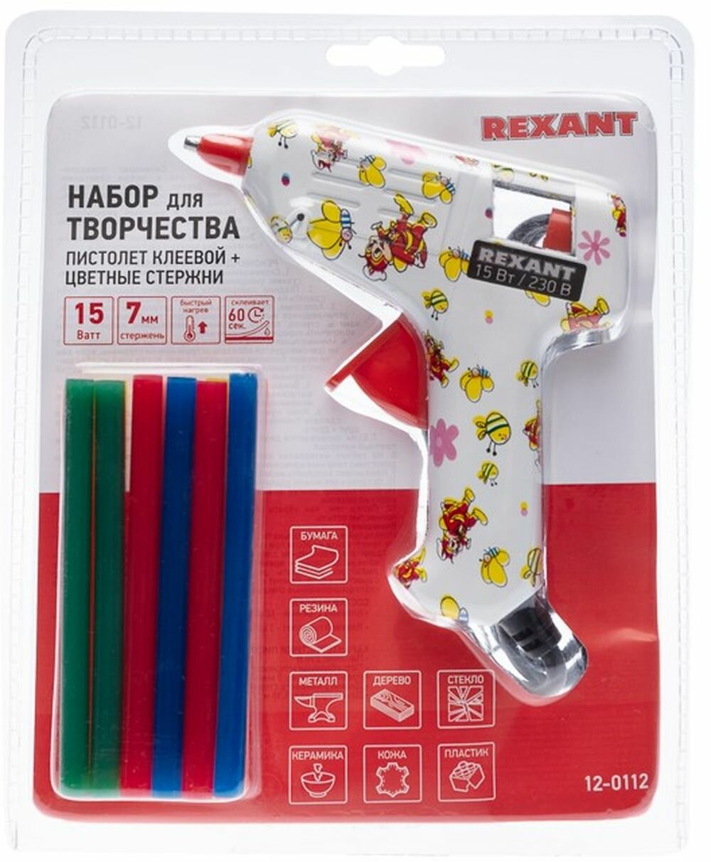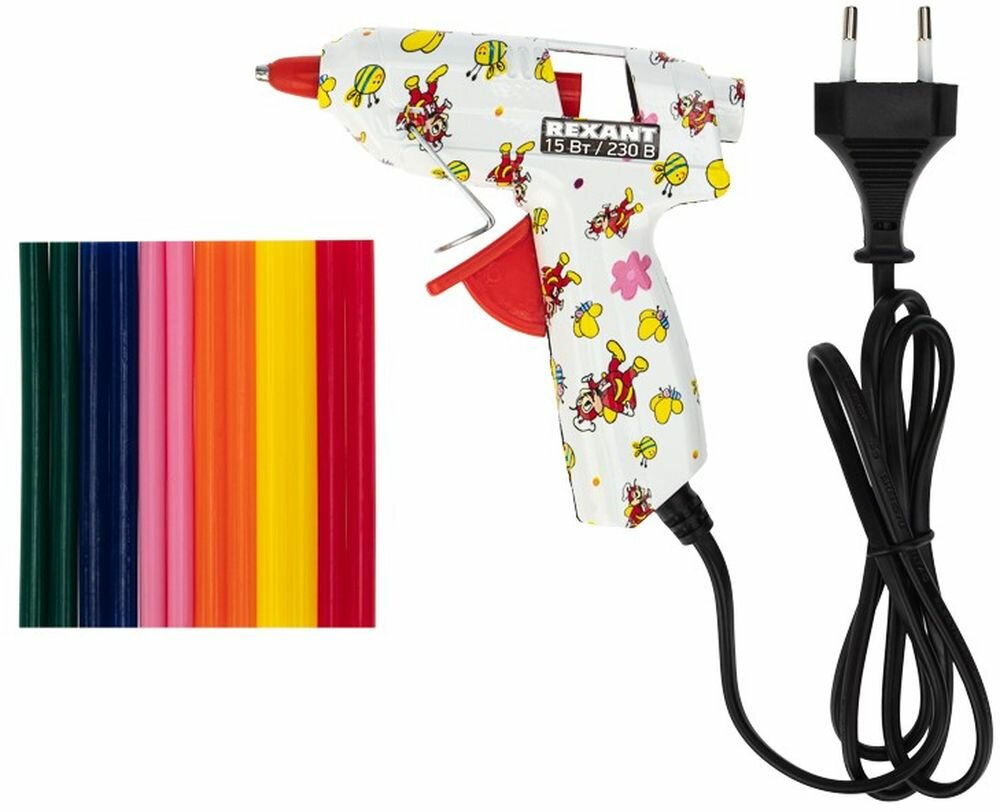 Пистолет клеевой REXANT, 15 Вт, Ø7 мм + набор цветных стержней 12 шт, блистер