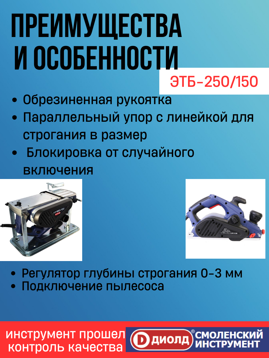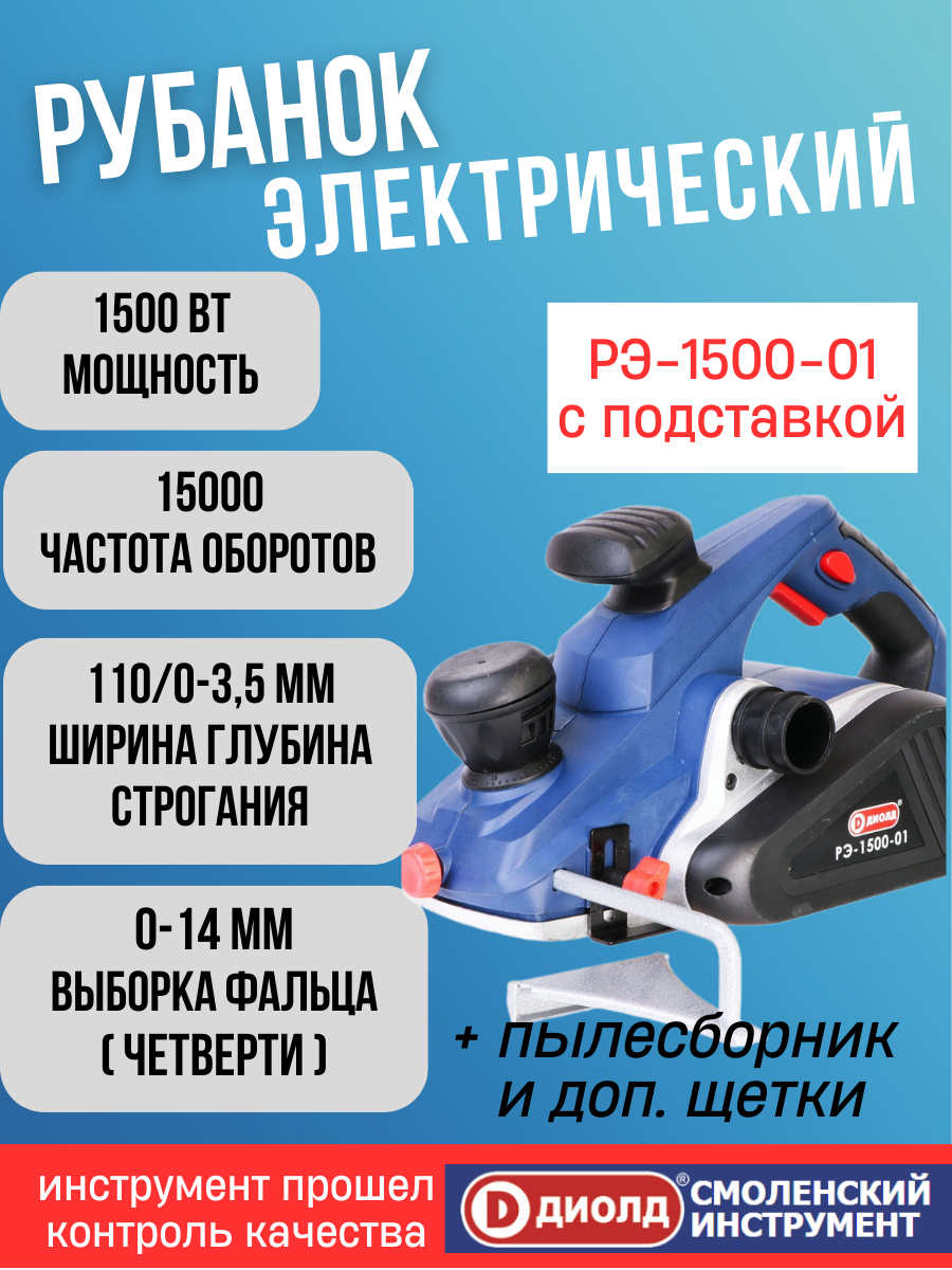 Рубанок электрический диолд РЭ-1500-01 с подставкой, 1500 Вт, 15000 об/мин, выборка фальца, подключение пылесоса, производитель россия интересное: