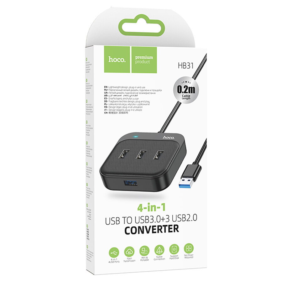 Купить USB HUB разветвитель HOCO HB31 Easy 4 в 1 USB3.0 (m) - 1xUSB3.0 (f) + 3xUSB2.0 (f), 20 см, черный