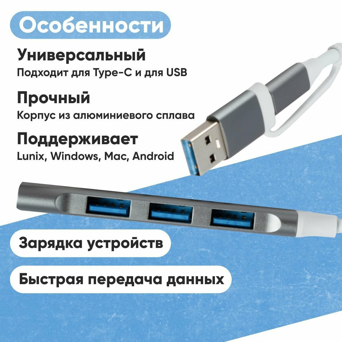 Разветвитель универсальный, USB HUB USB Type-C концентратор 3.0 на 4 порта, Хаб на 4 USB (0,1 м) серебристый интересное: