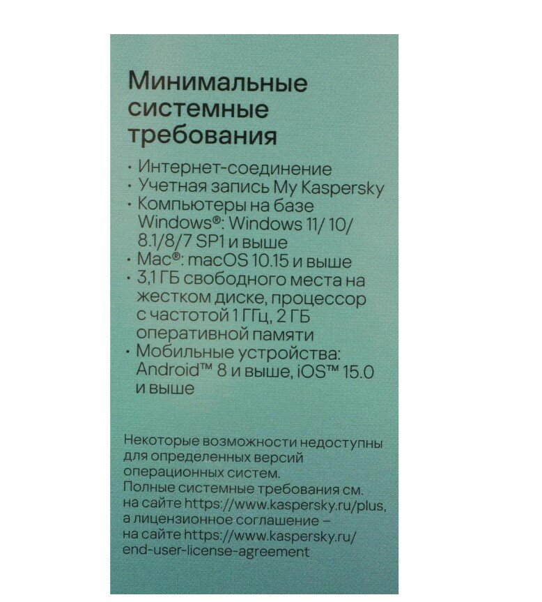 | Дополнительная информация | Чтобы обеспечить стабильную совместимость с ОС Windows 11 и 10, загрузите и установите все доступные обновления для вашего защитного продукта «Лаборатории Касперского». Продукт не предназначен для использования с версиями ОС Windows 11/10 Mobile/IoT Базовая/S/для образовательных учреждений |