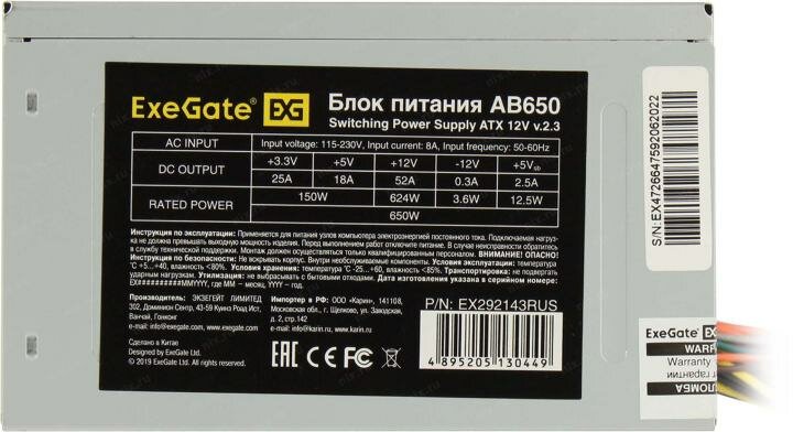 Exegate EX292143RUS-PC Блок питания 650W ExeGate AB650 (ATX, PC, 8cm fan, 24pin, 4+4pin, PCI-E, 3xSATA, 2xIDE, кабель 220V в комплекте)