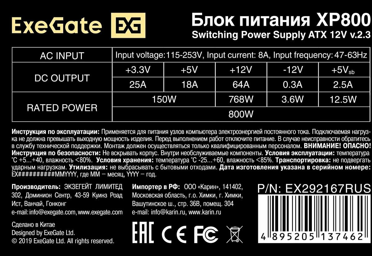Блок питания Exegate XP800 (EX292167RUS)