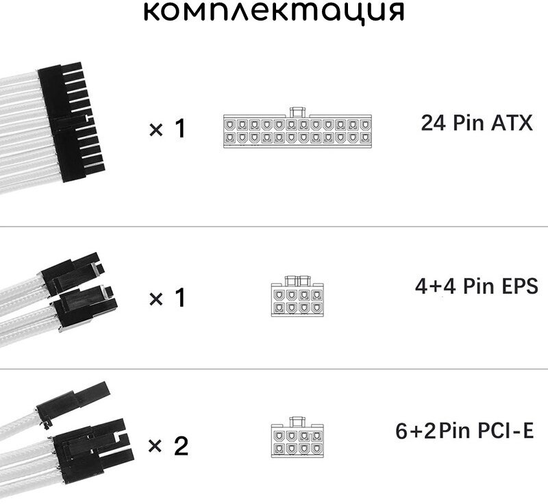 Набор 6шт - Кастомные удлинители проводов блока питания и материнской платы, видеокарты в оплетке 30 см, Белый