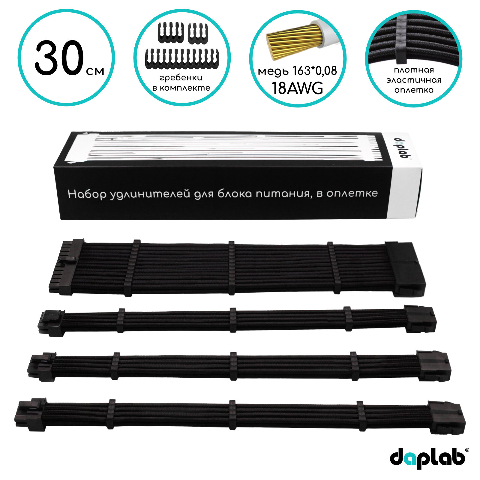 СохранитьНабор 4шт - Кастомные удлинители проводов блока питания и материнской платы, видеокарты в оплетке 30 см, черный интересное: