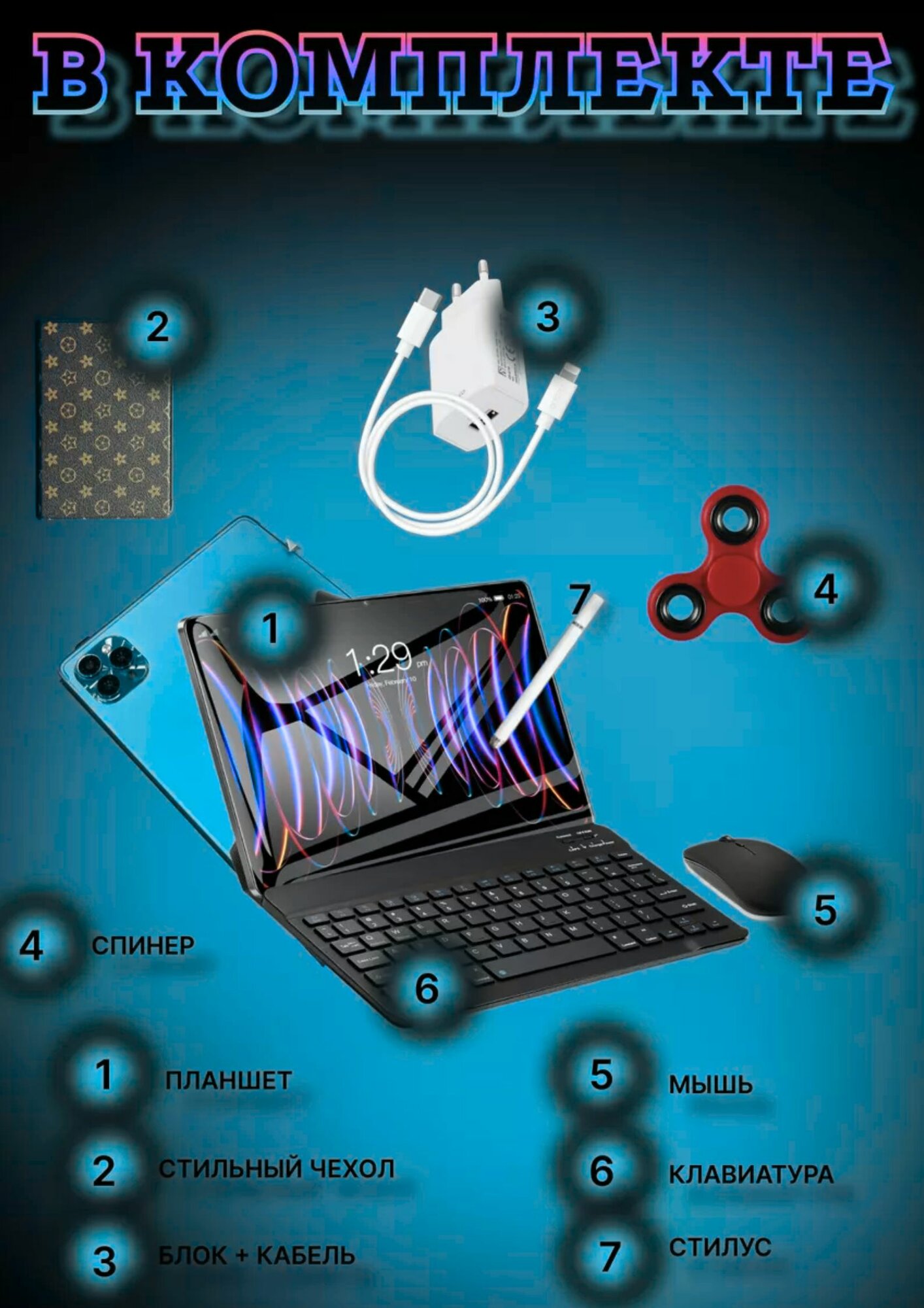 | Комплектация | Планшет, стилус, клавиатура, мышка, защитное стекло, чехол, зарядник |
