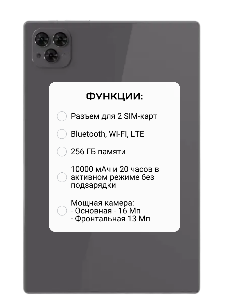 | Особенности | Планшет со всеми комплектующими |