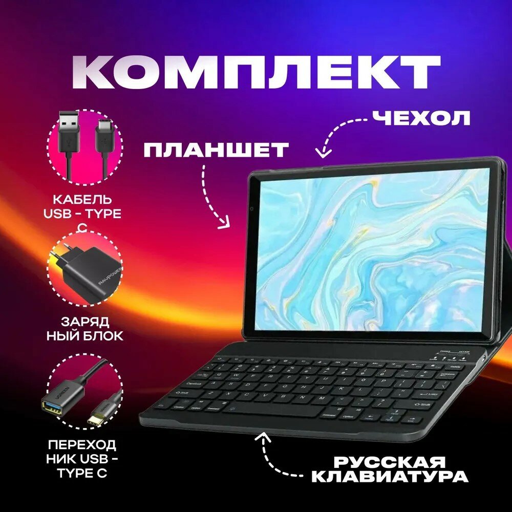 | Комплектация | Планшет, чехол, зарядка, русская клавиатура |