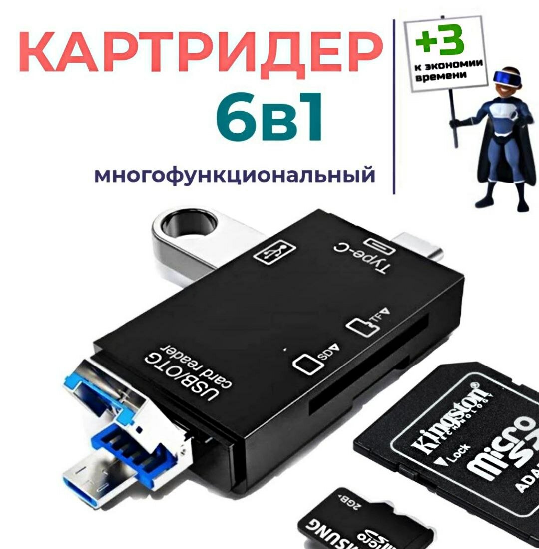 Сохранить6 в 1 Картридер USB 2.0 Type-C microUSB для карт памяти microSD TF для компьютера и телефона. Адаптер для ноутбука, для телефона Android. Черный интересное: