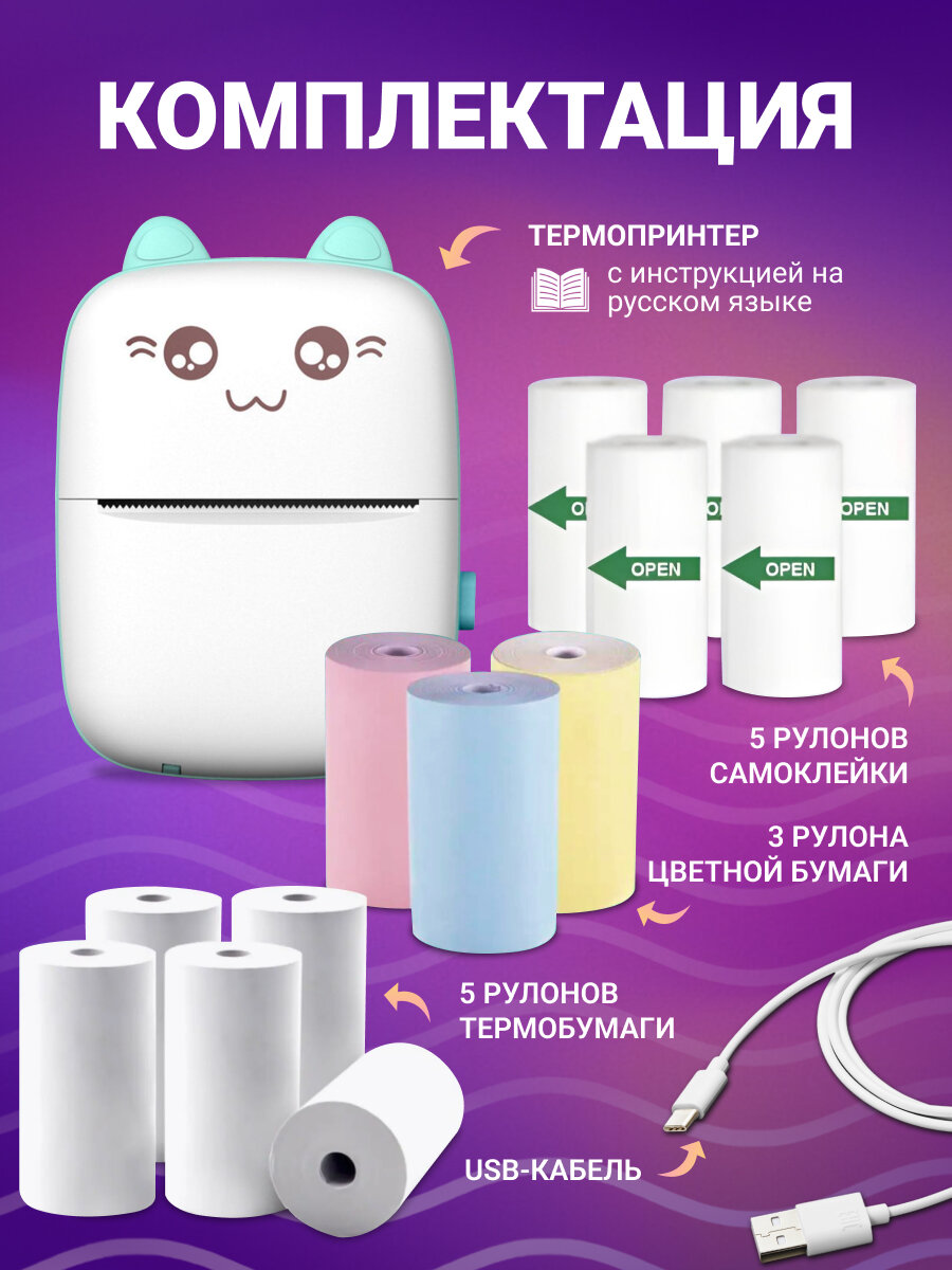 | Комплектация | Принтер, USB провод, инструкция, 5 рулонов термобумаги, 5 рулонов самоклейки, 3 рулона цветной термобумаги |