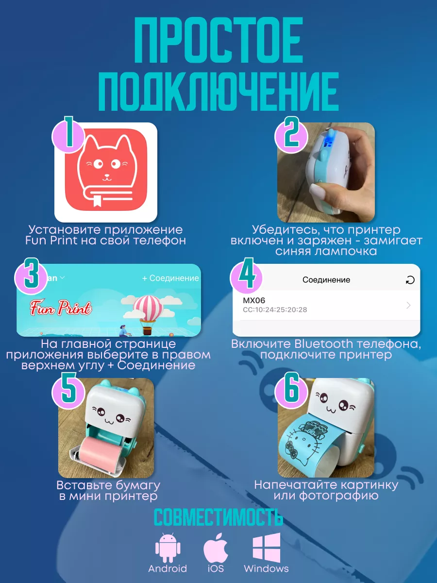 Мини-карманный (голубой) принтер, детские подарки, портативный термопринтер, может печатать квитанцию, заметку, этикетку. Bluetooth беспроводной смарт-принтер интересное:
