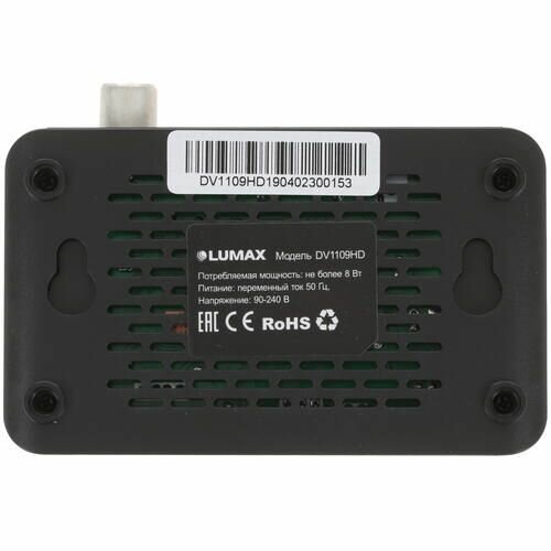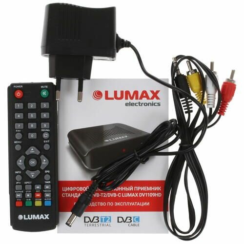 Цифровой телевизионный приемник Lumax DV1109 HD, черный пластиковый корпус. внешний блок питания.