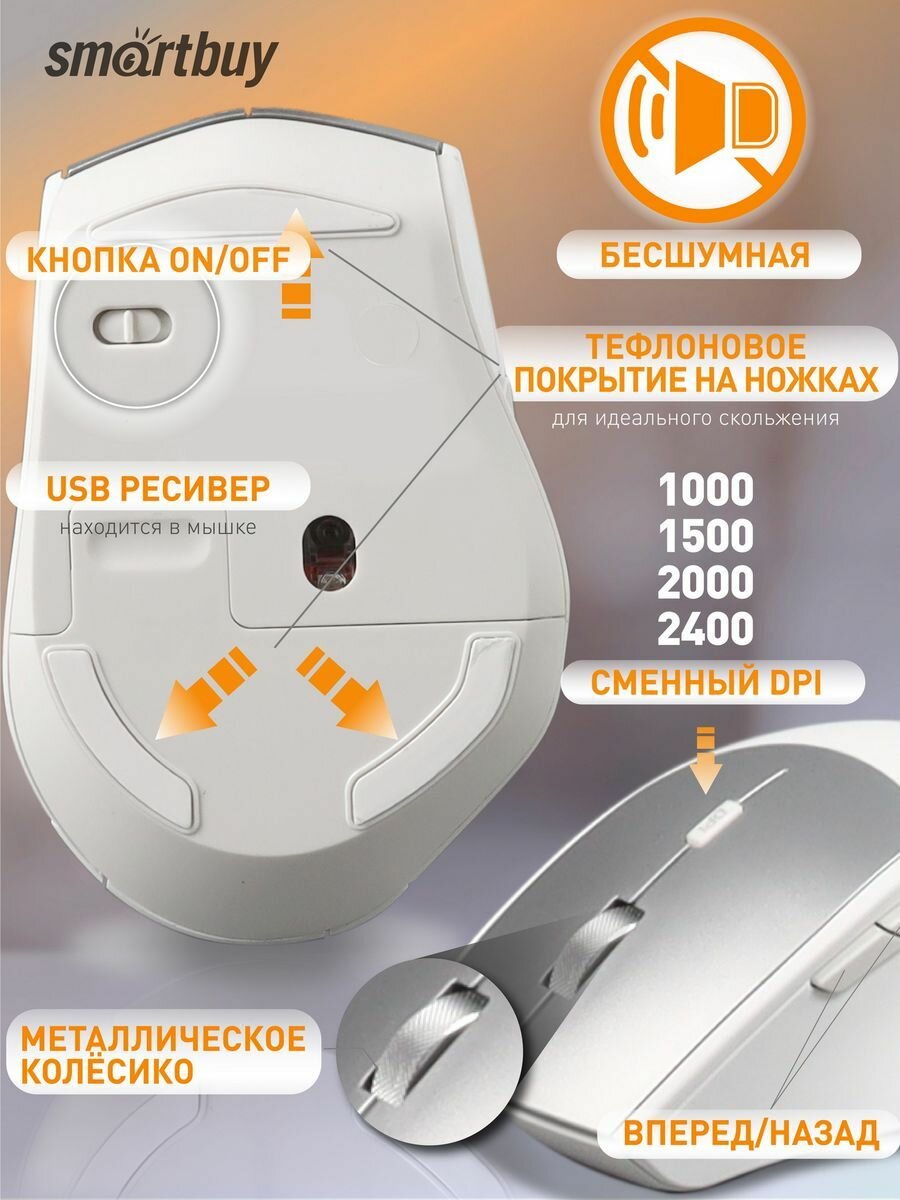 Комплект клавиатура + мышь SmartBuy 233616AG-SW, беспроводной, с нано-приемником, 2400 DPI, серебристый