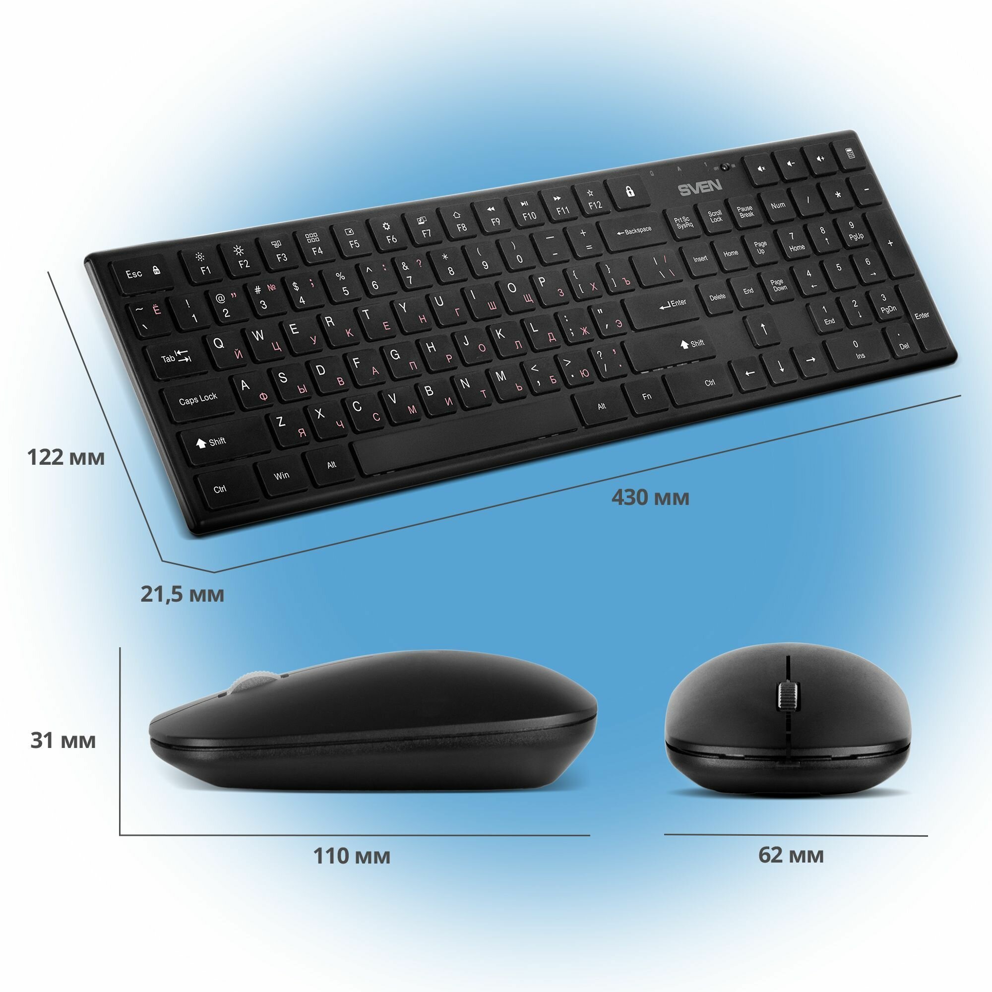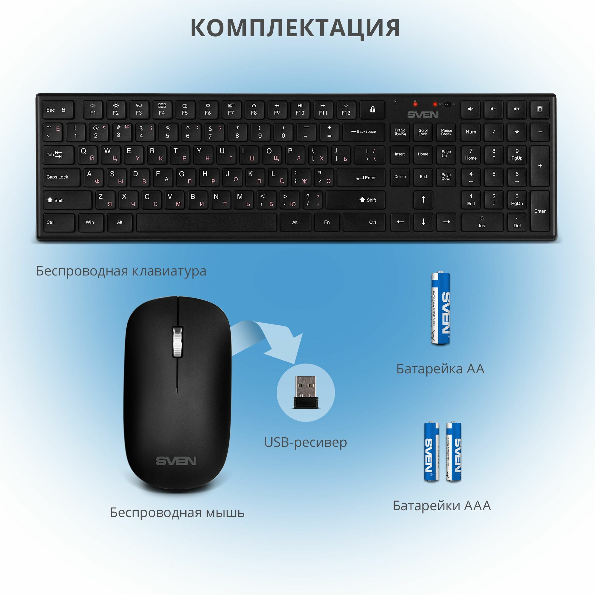Клавиатура и мышь Sven Беспроводной набор ножничная клавиатура+мышь KB-C2550W чёрный (109 кл.,12Fn, 1000DPI, 2+1 кл.)