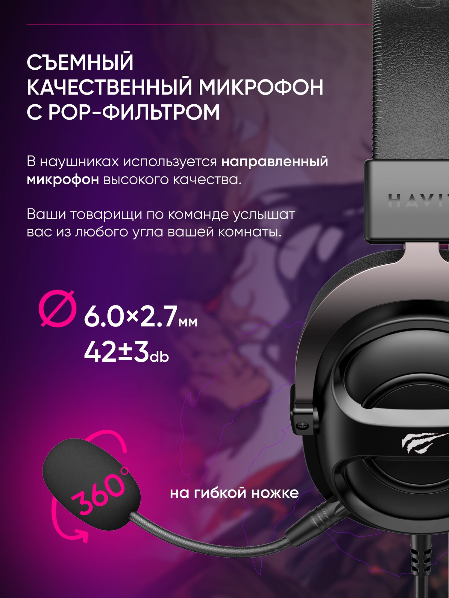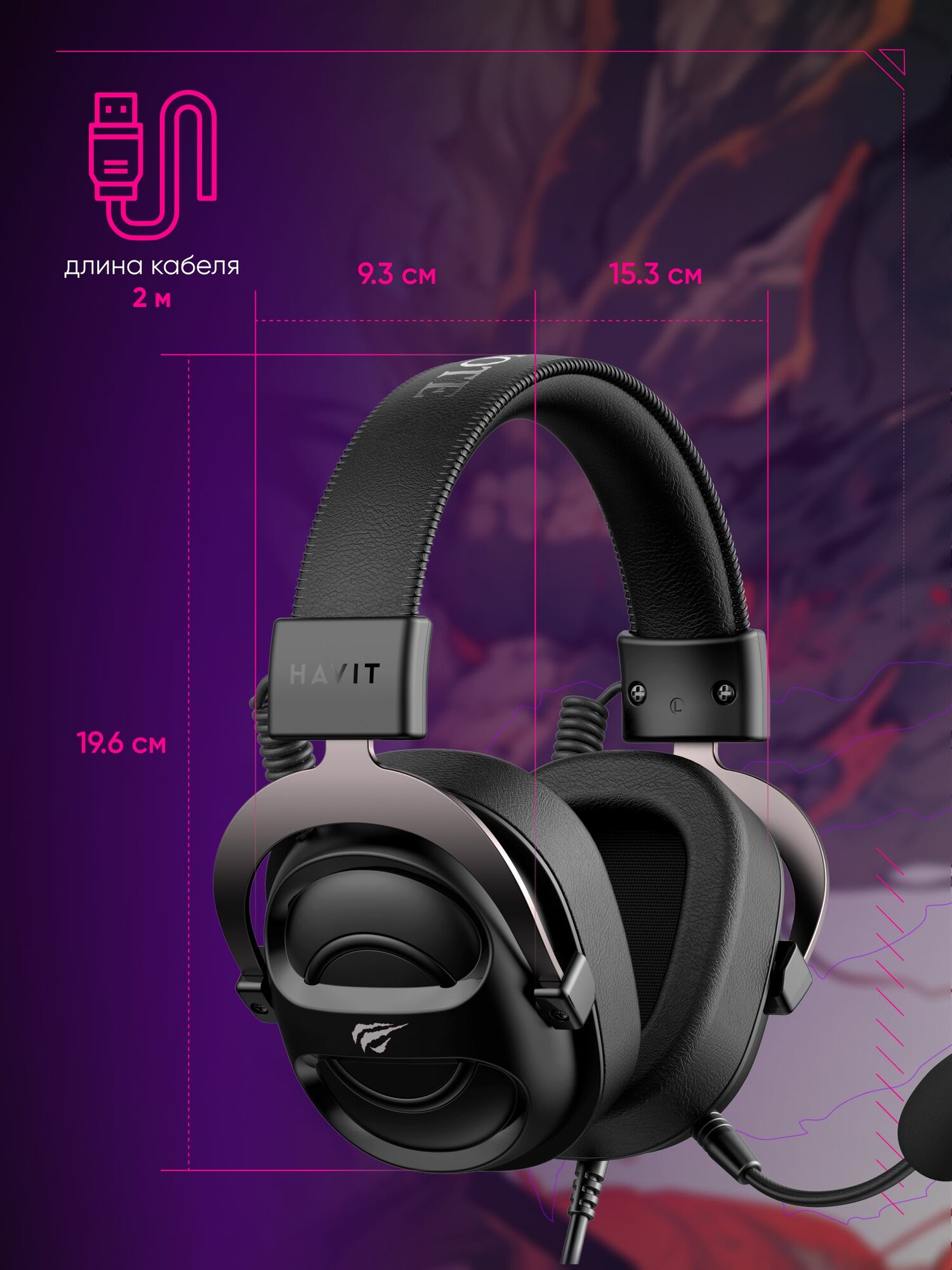 Игровые наушники Havit H2016d, закрытого типа, с гибким микрофоном и регулировкой громкости, шнур 2 м, черные