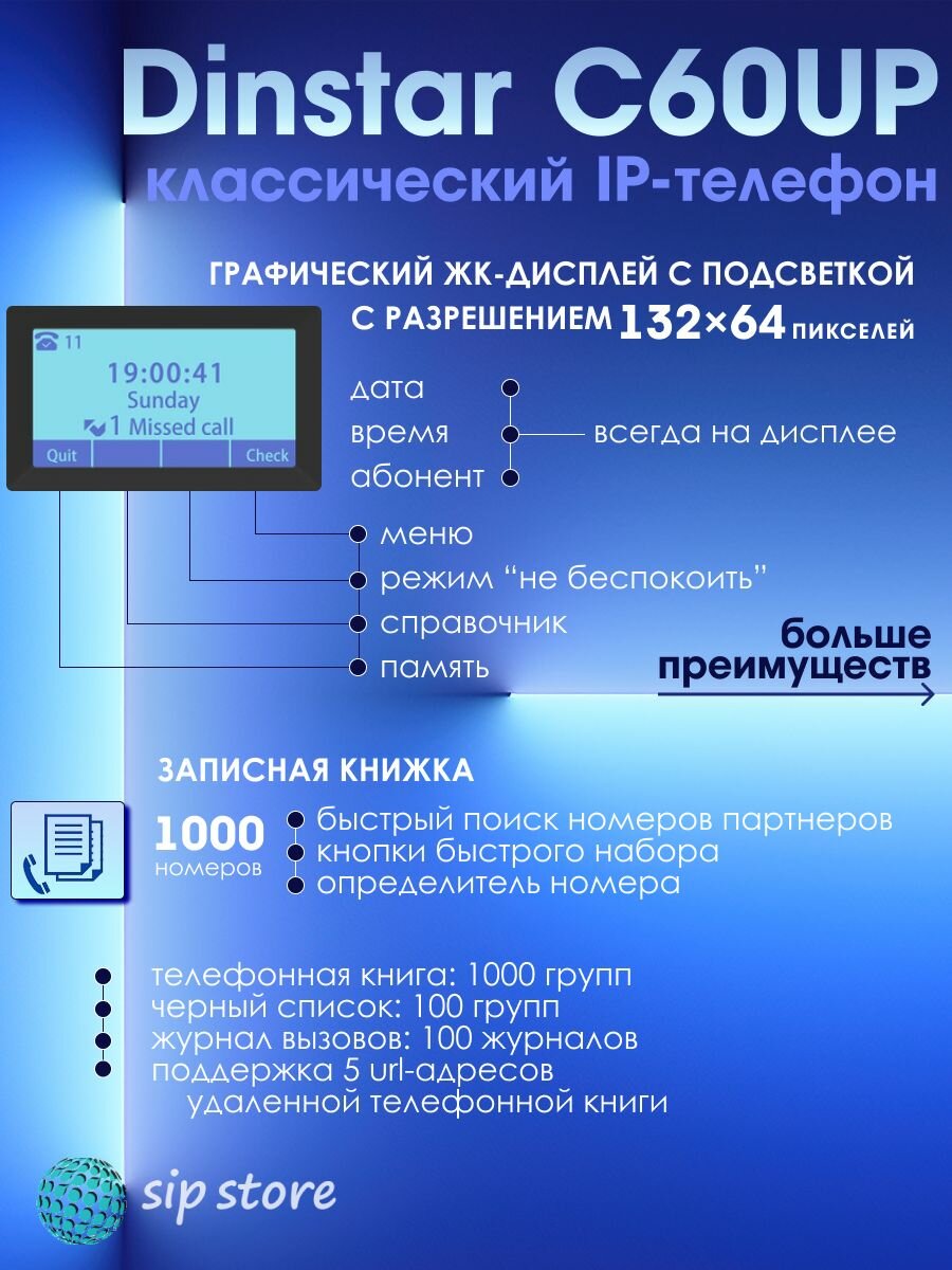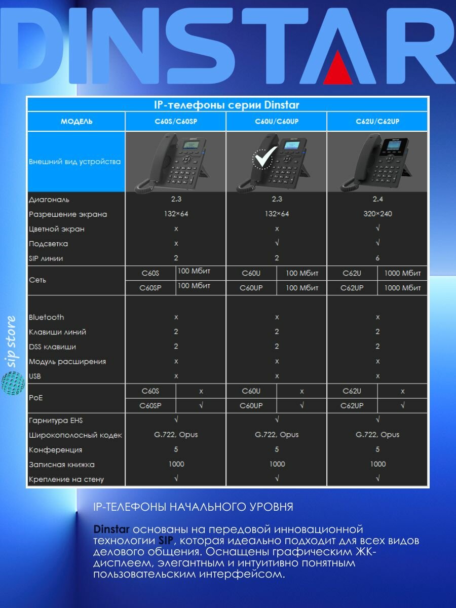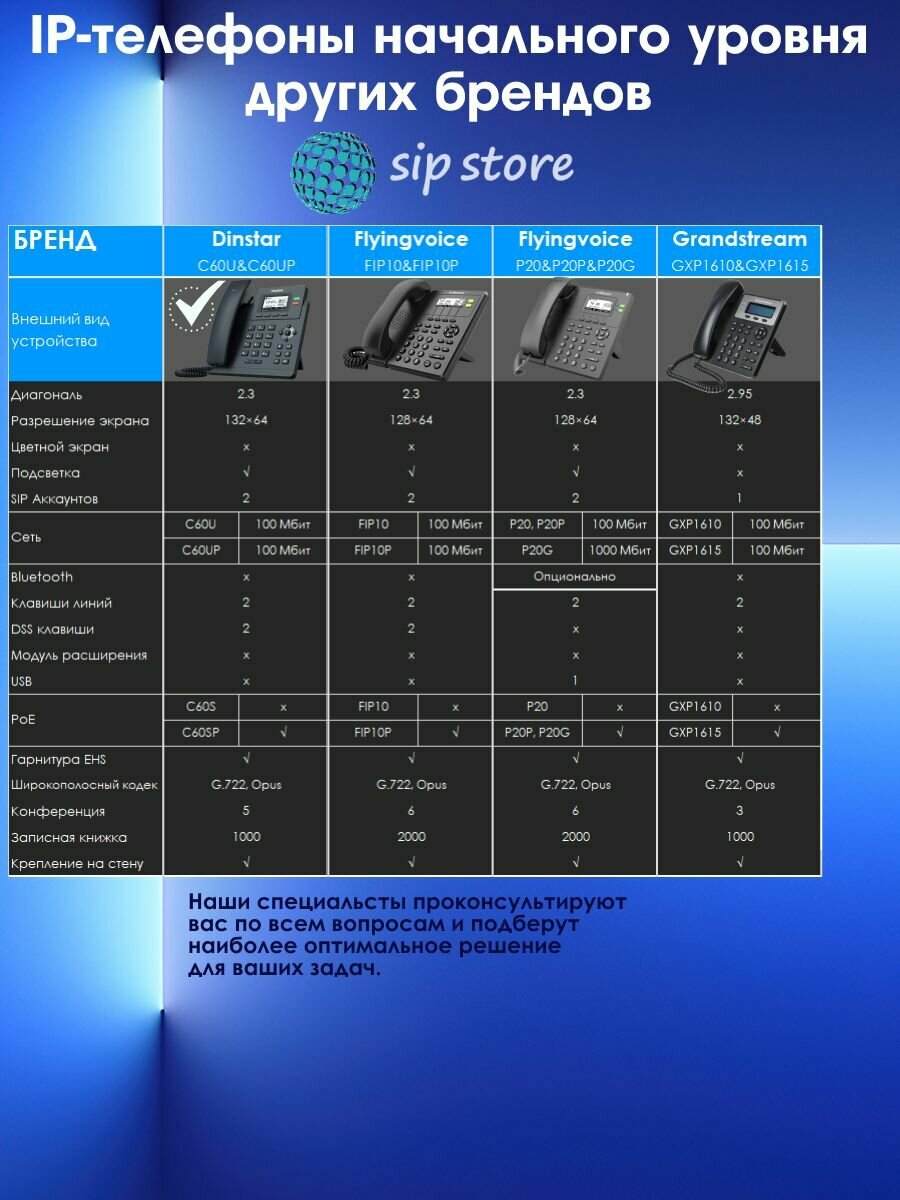 IP-телефон Dinstar C60UP, 2 SIP аккаунта, монохромный дисплей 2,3 дюйма с подсветкой, конференция на 5 абонентов, поддержка EHS. интересное: