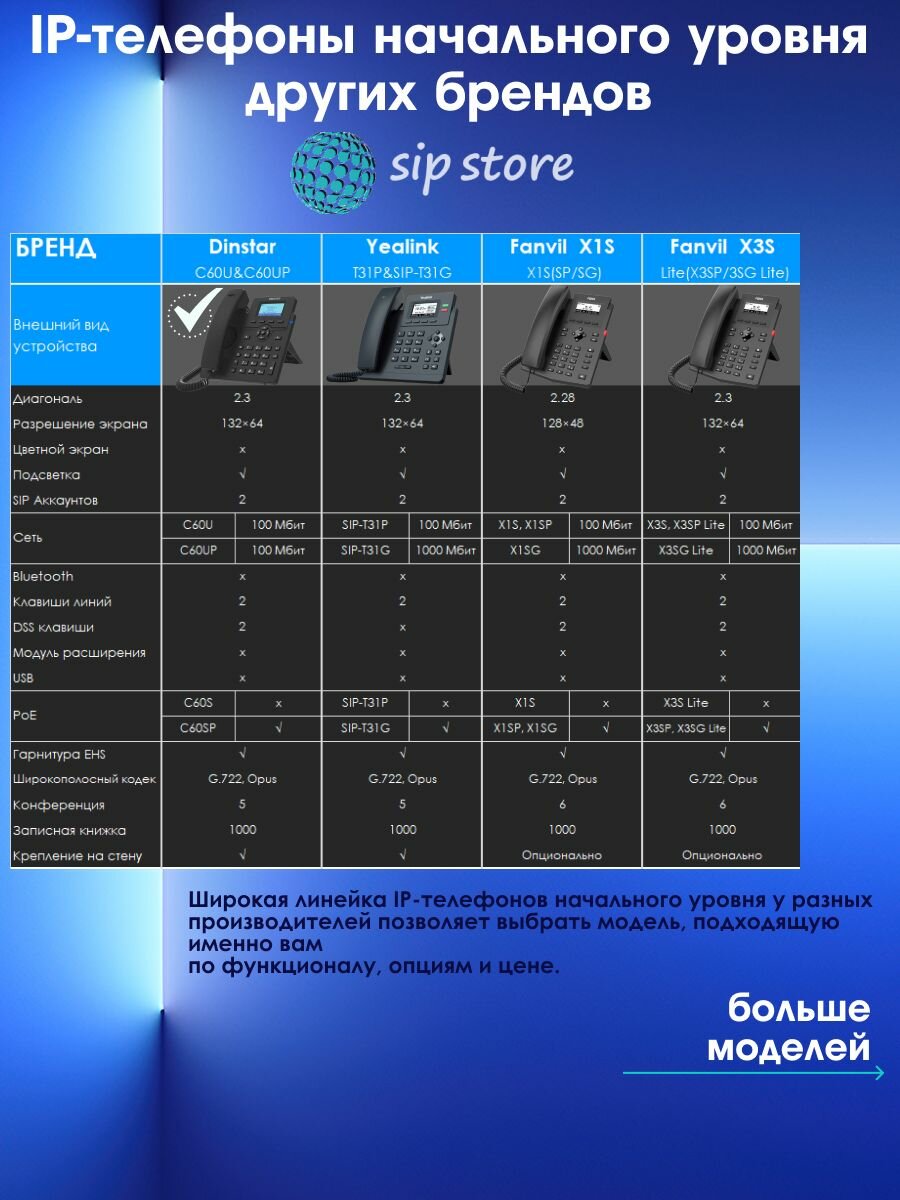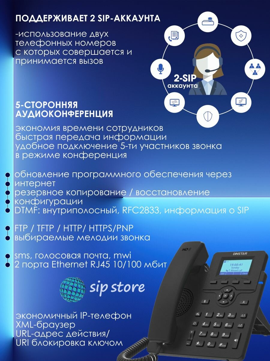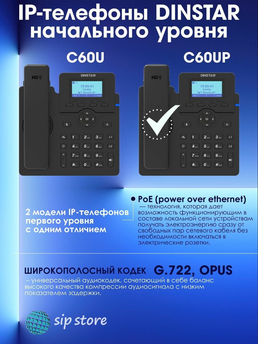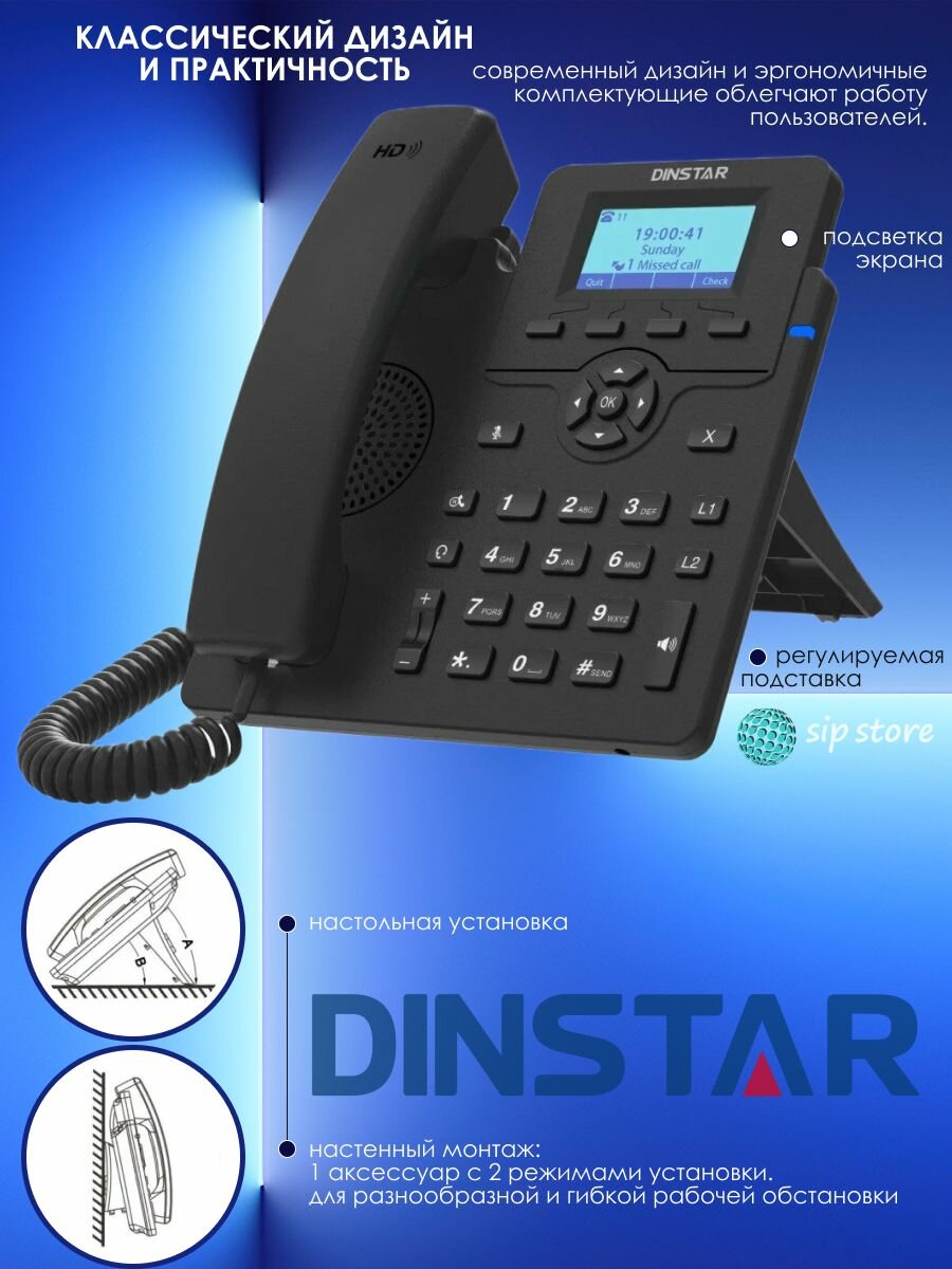 IP-телефон Dinstar C60UP, 2 SIP аккаунта, монохромный дисплей 2,3 дюйма с подсветкой, конференция на 5 абонентов, поддержка EHS. интересное: