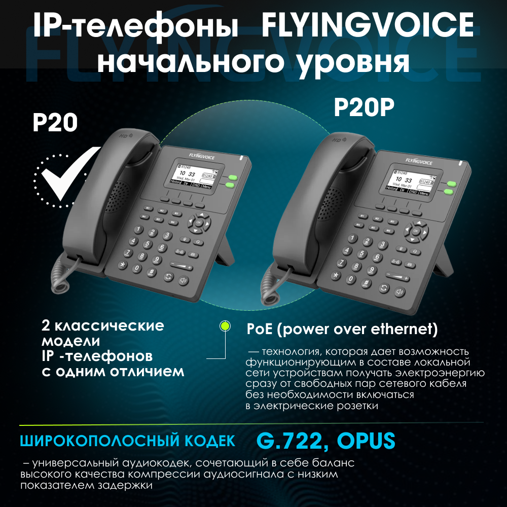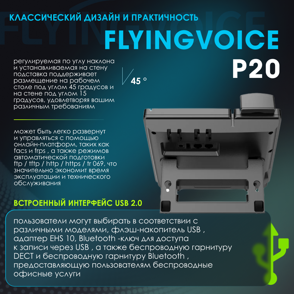 IP-телефон FLYINGVOICE P20, 2 SIP аккаунта, монохромный дисплей 2,3 дюйма, 132 x 64 с подсветкой, конференция на 6 абонентов, (RJ9)/DECT, USB и Wi-Fi интересное:
