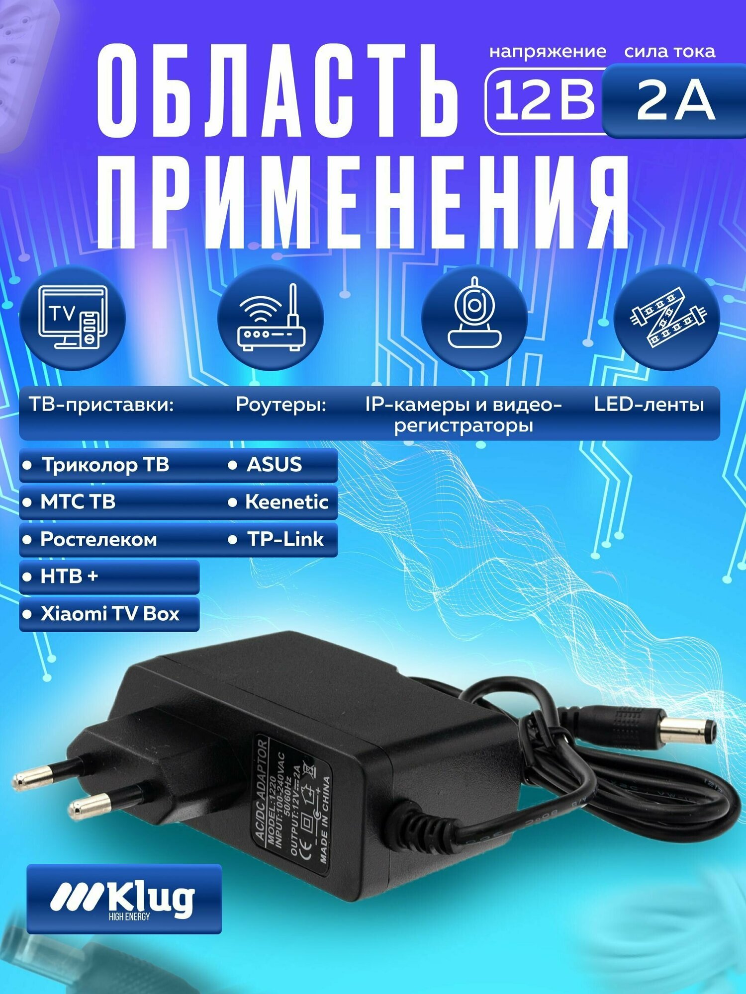 Блок питания 12 вольт 2 ампера (штекер 5.5х2.1) для светодиодной ленты, роутера, камеры видеонаблюдения, Триколор ТВ, ТВ приставки, ресивера, Klug интересное: