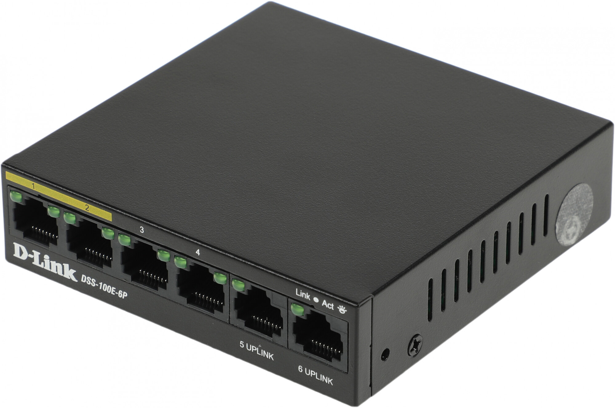 Купить D-Link DSS-100E-6P/A1A Неуправляемый коммутатор с 6 портами 10/100Base-TX (4 порта PoE 802.3af/at, PoE-бюджет 55 Вт, дальность до 250 м)