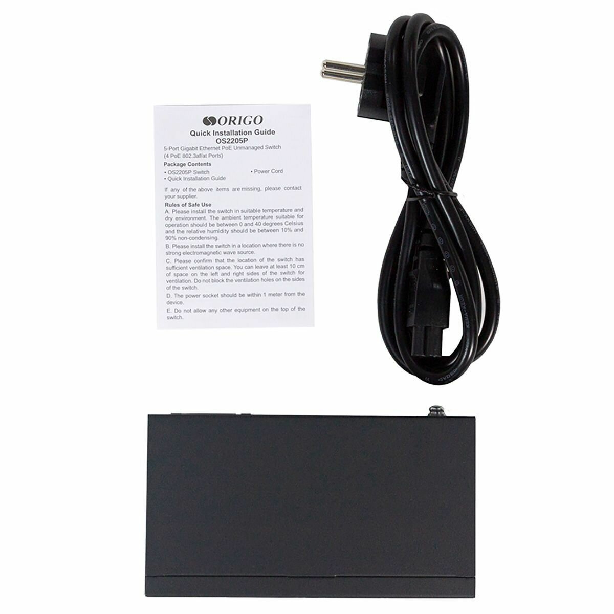 Коммутатор ORIGO OS2205P/60W/A1A Неуправляемый PoE-коммутатор 4x1000Base-T PoE+, 1x1000Base-T, PoE-бюджет 60 Вт