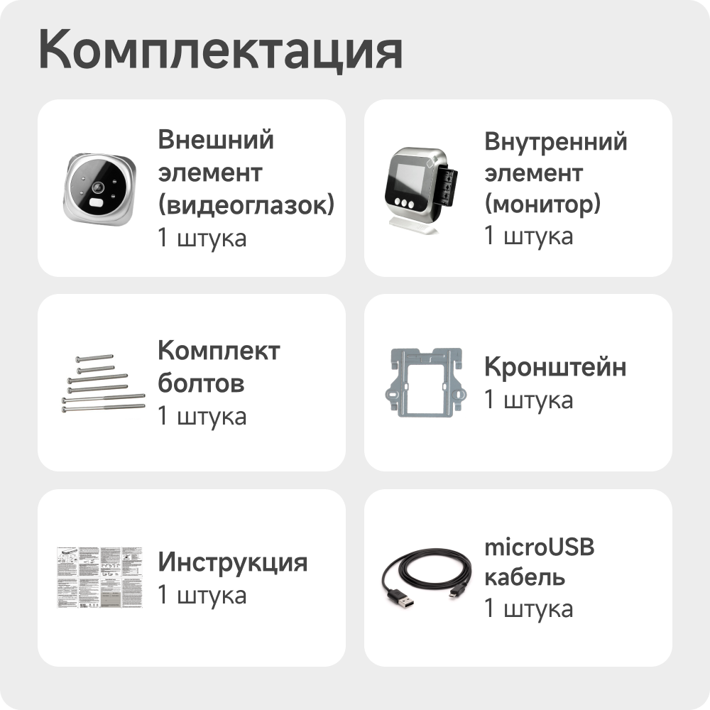 | Дополнительная информация | Возможность записи фото вручную допускает личную фиксацию происходящего за дверью одним нажатием на кнопку монитора. Видеоглазок также сделает фото гостя, когда он нажмет на кнопку звонка снаружи. |