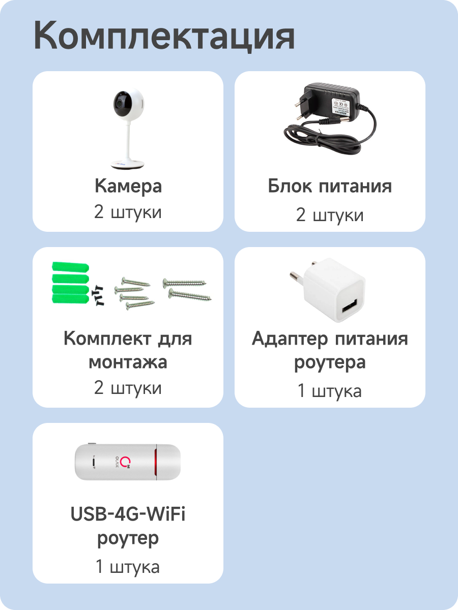 | Подробная комплектация | Камера; Кабель питания; Блок питания; Монтажный комплект; 4G Роутер с адаптером |