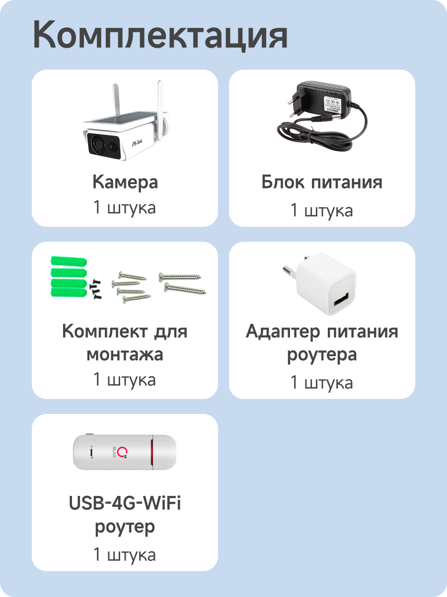 | Подробная комплектация | Камера GBR30; Солнечная панель; Аккумуляторы 18650; Монтажный комплект; Отвертка; USB-WIFI-4G модем; Блок питания модема; Руководство пользователя |