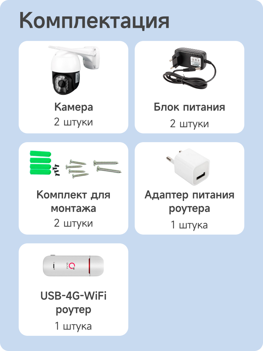 | Подробная комплектация | Камера; Адаптер питания камеры; Монтажный комплект; USB-WIFI роутер; Адаптер питания роутера |