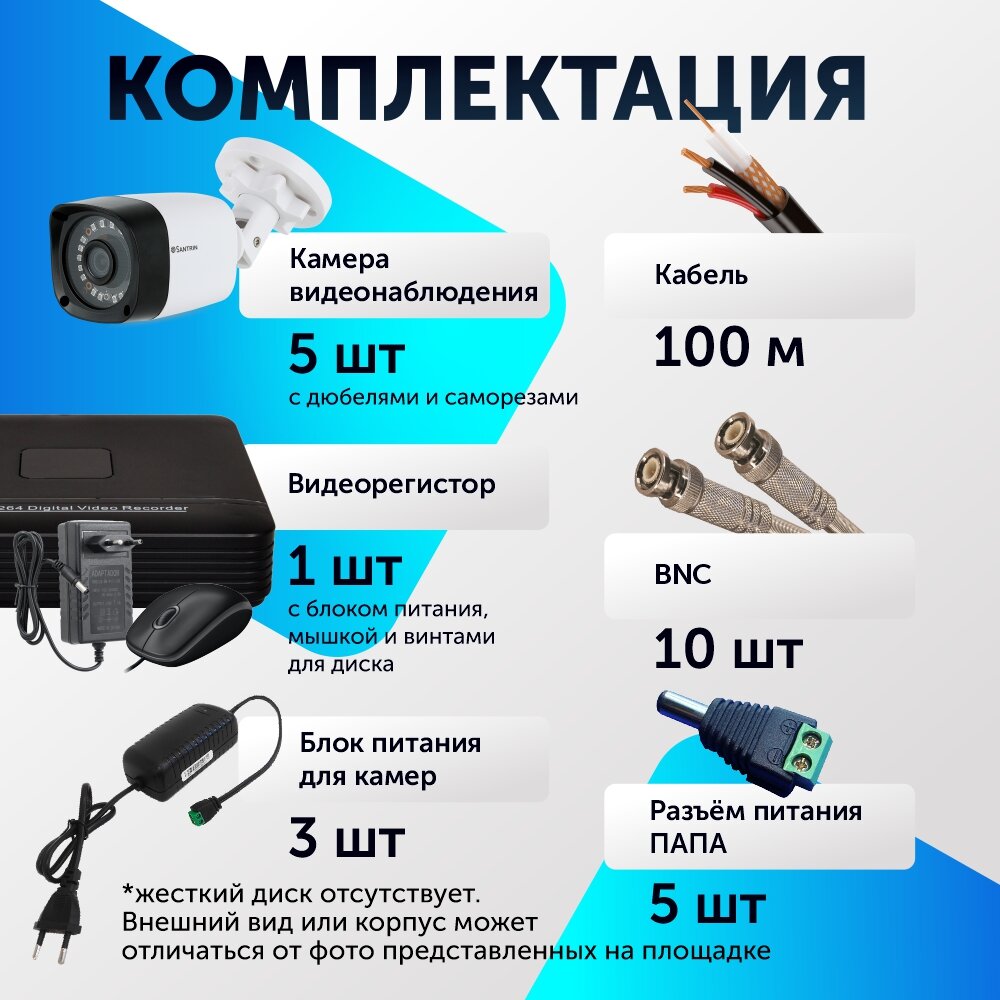 | Подробная комплектация | Гибридный видеорегистратор 1 шт; 2 Mpix цилиндрическая AHD камера 5 шт; Блок питания для камер 3 шт; Блок питания для видеорегистратора 1шт; Уличный кабель видеонаблюдения 100 метров; Инструкции на русском языке; Проводная мышь 1 шт. |