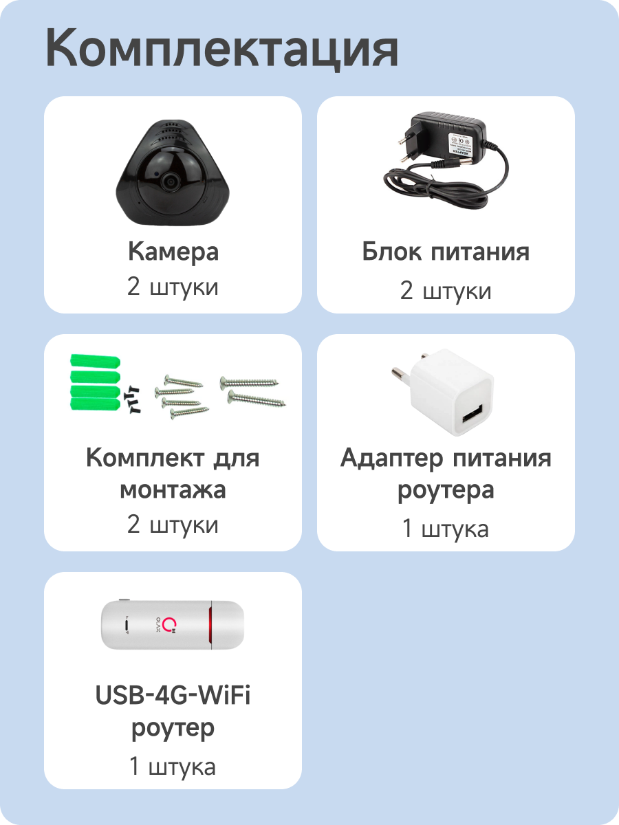| Подробная комплектация | Камера; Адаптер питания; 4G роутер с адаптером; Комплект винтов; Кронштейн; Руководство пользователя |